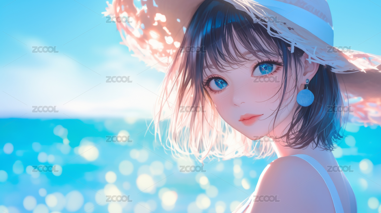 少女,草帽,海边,沙滩,长发,水彩画,连衣裙,海风,蓝天,海浪