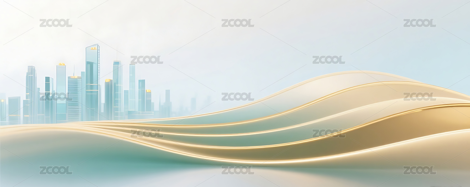 流畅的绿金色渐变波浪线条玻璃城市建筑