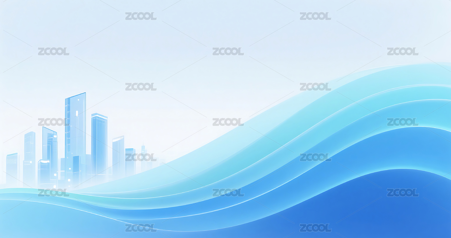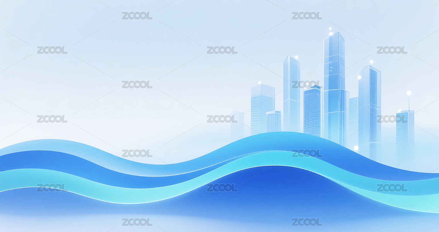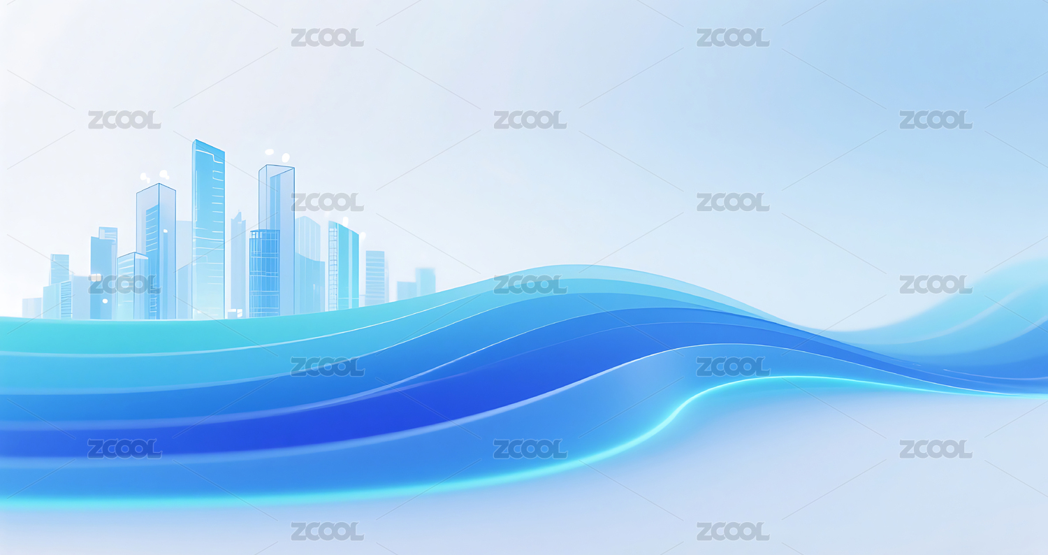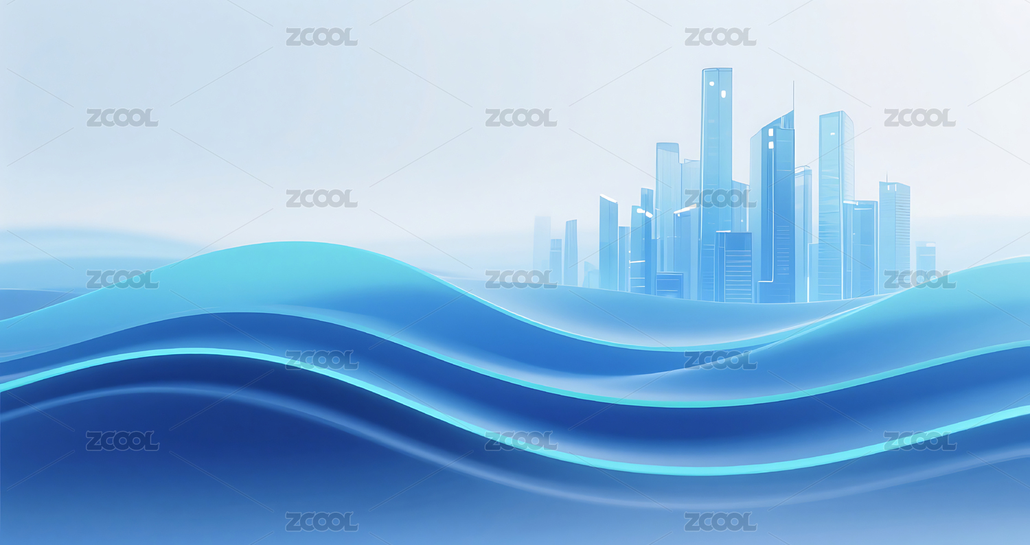 流畅的蓝色渐变波浪线条玻璃城市建筑