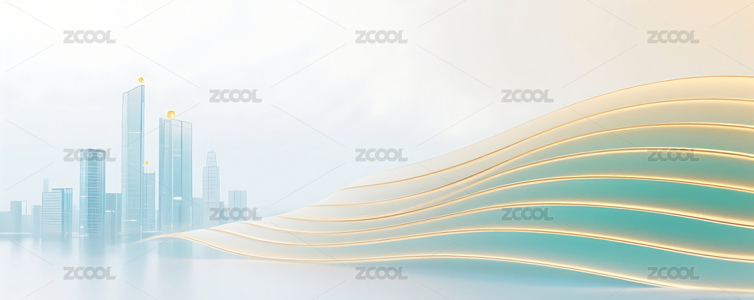 流畅的绿金色渐变波浪线条玻璃城市建筑