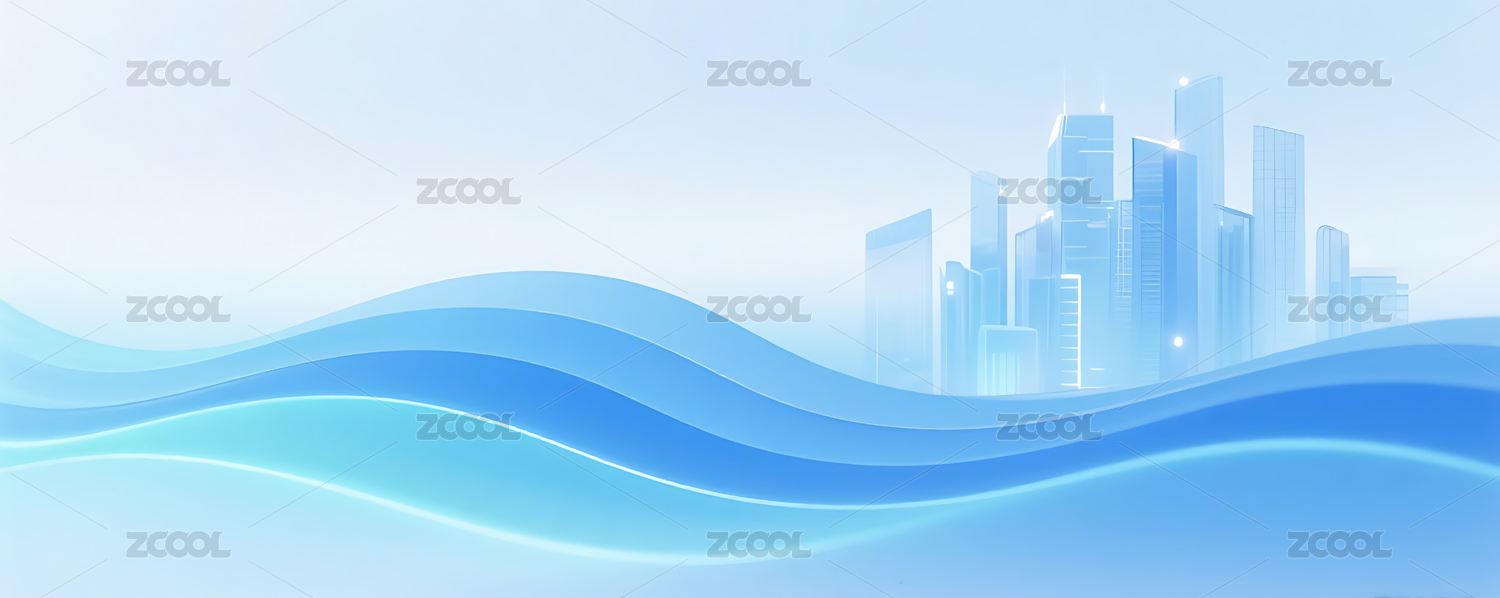 流畅的蓝色渐变波浪线条玻璃城市建筑
