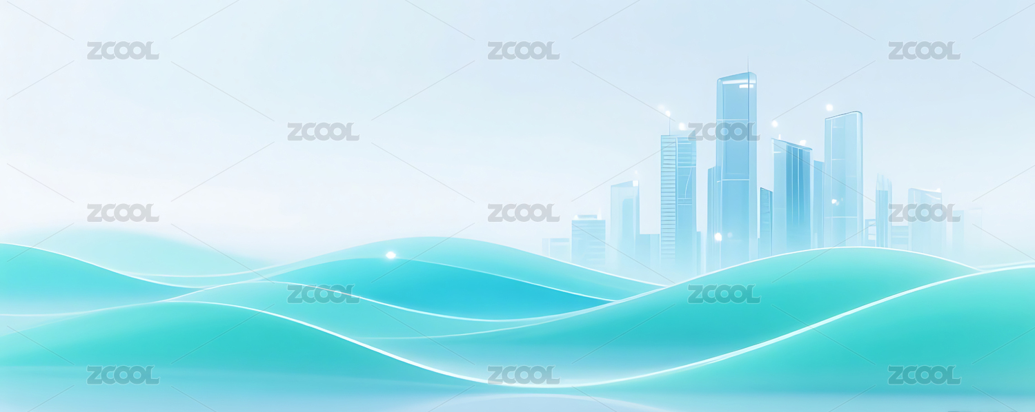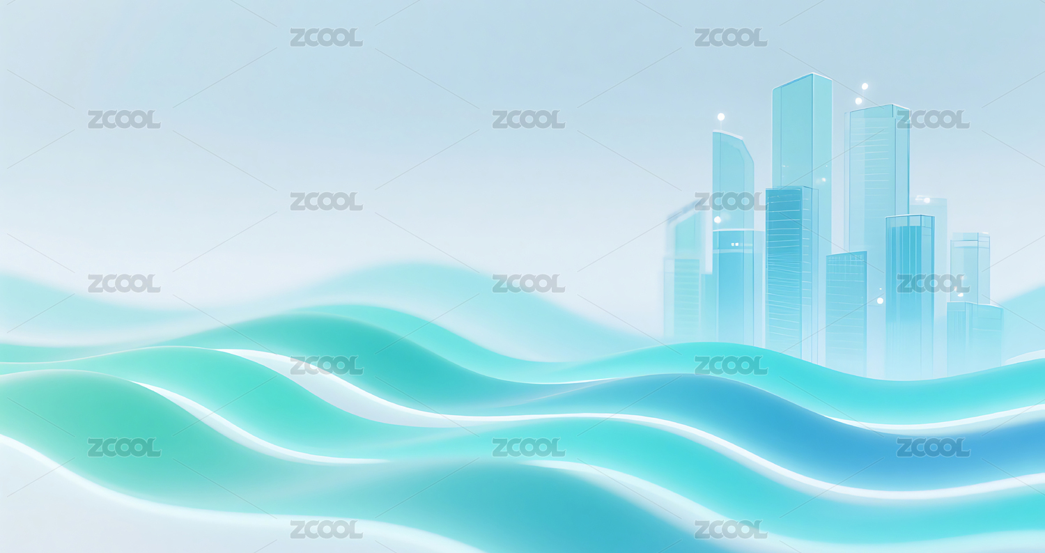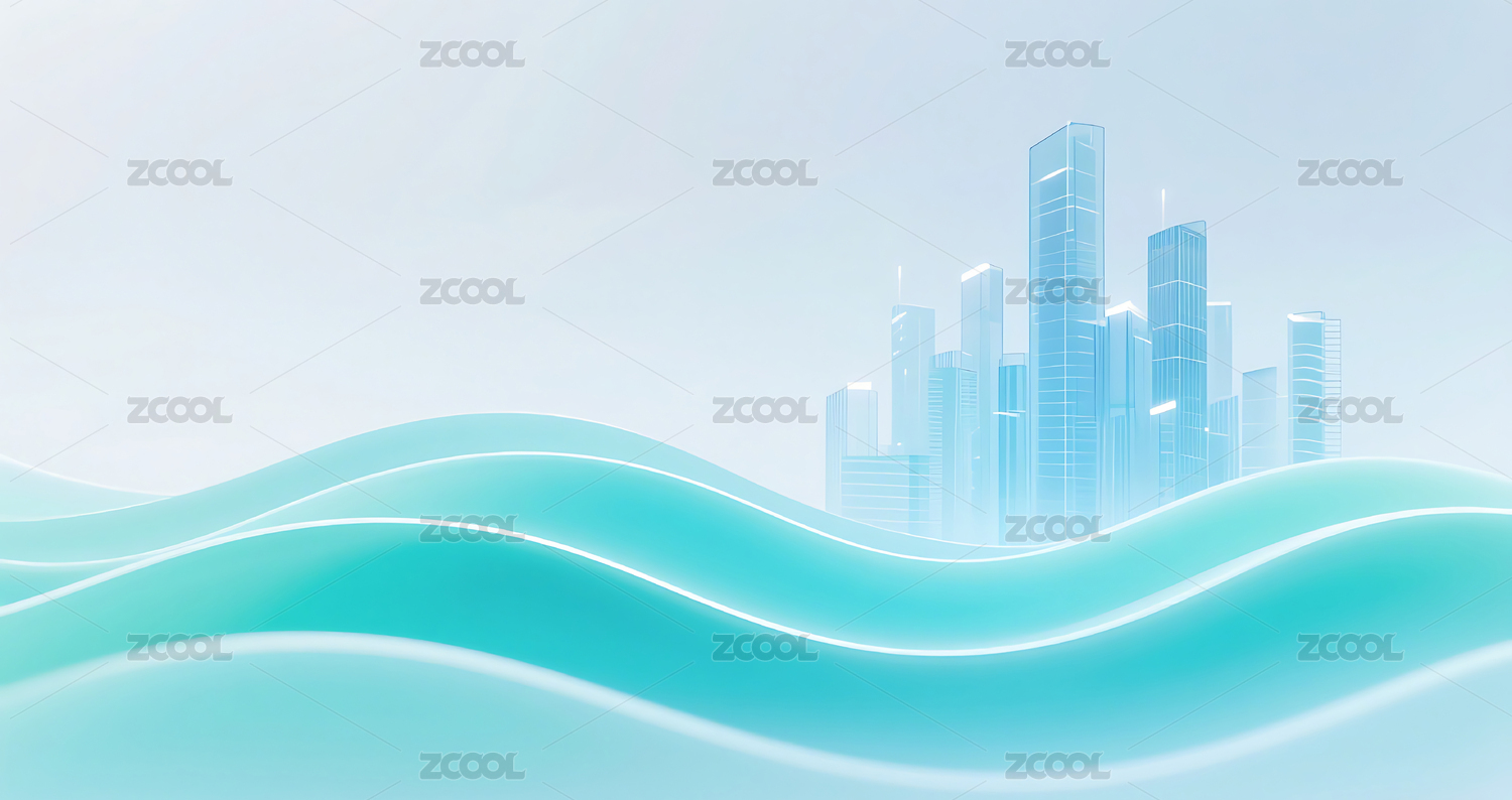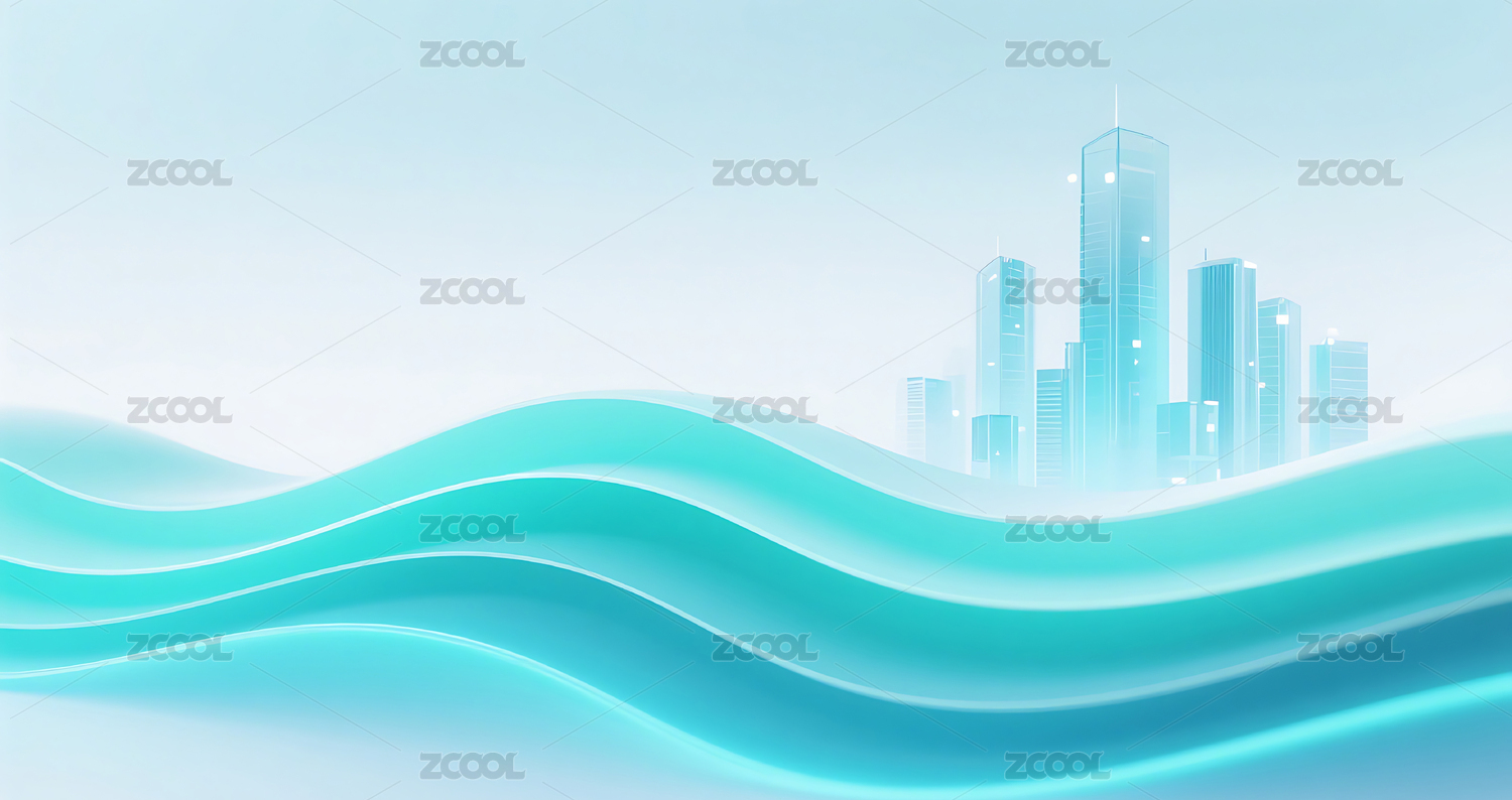 流畅的蓝绿色渐变波浪线条玻璃城市建筑