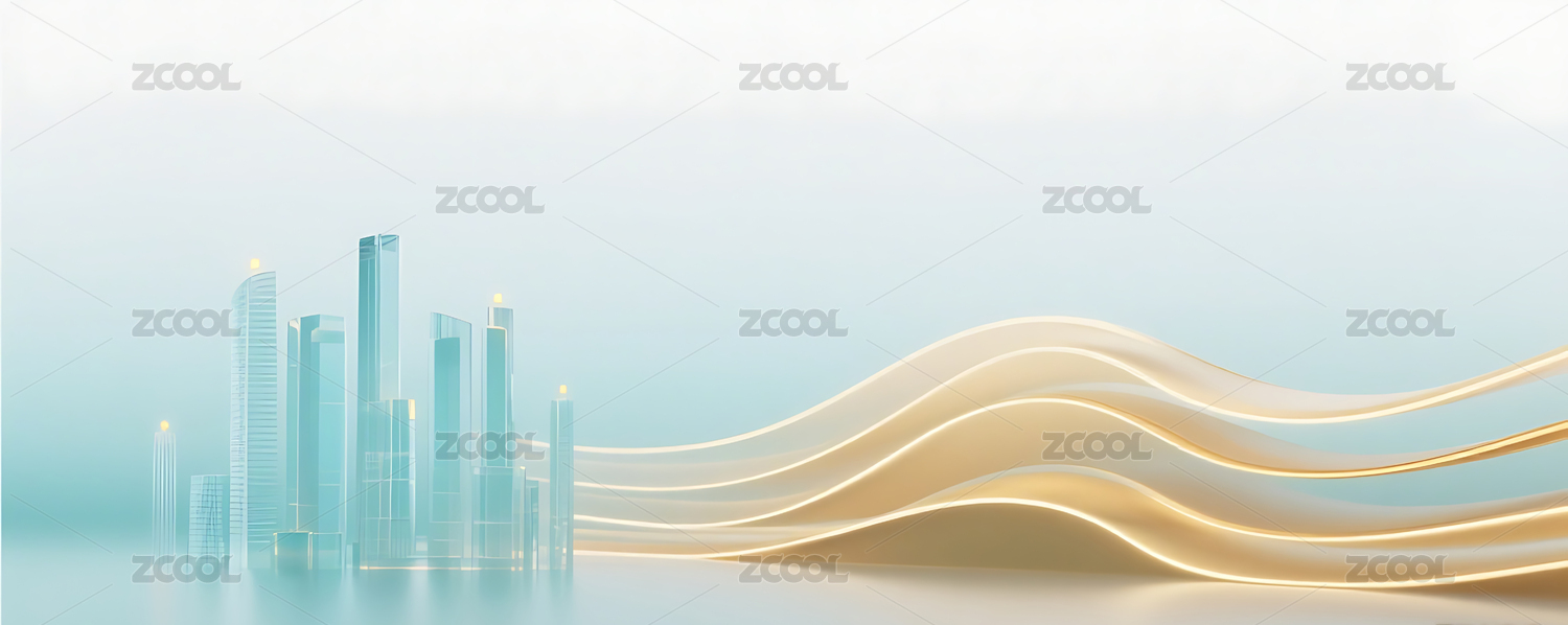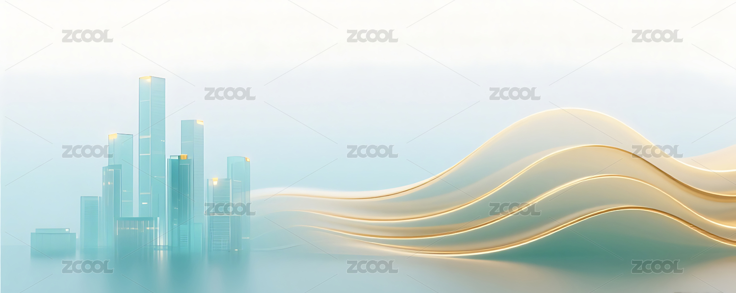 流畅的绿金色渐变波浪线条玻璃城市建筑