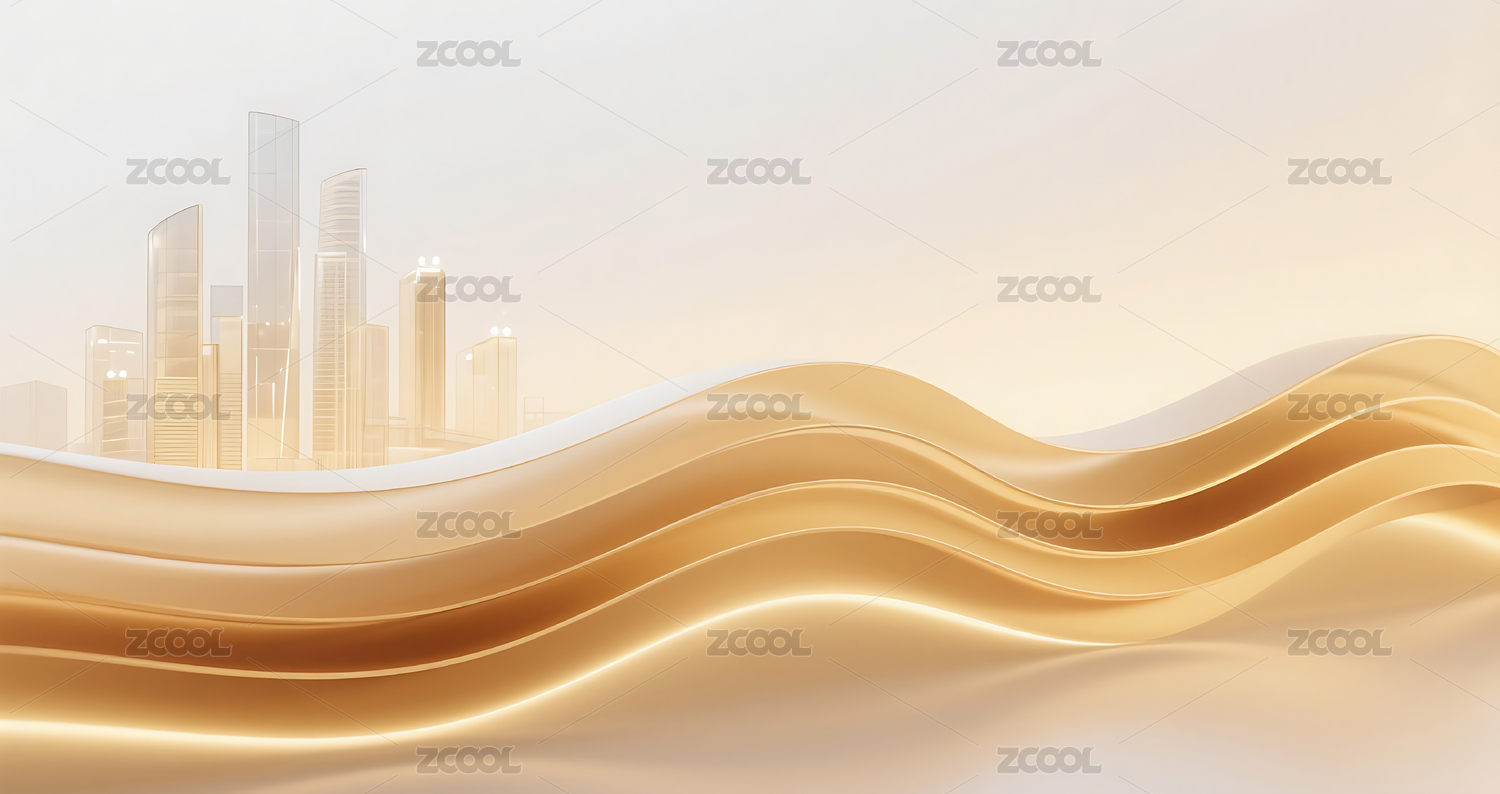 流畅的绿金色渐变波浪线条玻璃城市建筑