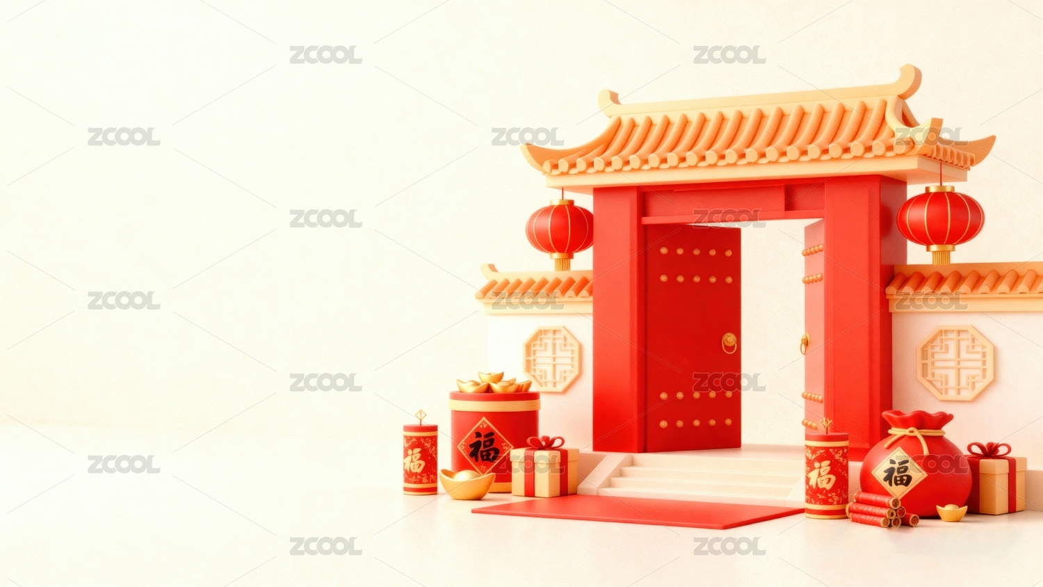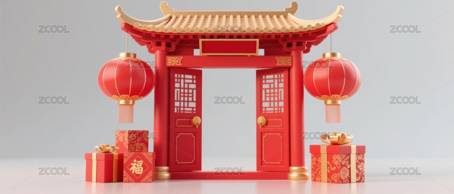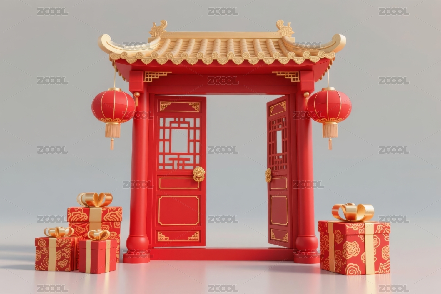 主视觉,商业,壁纸,中式,门楼,新春,装饰,场景,红色,建筑