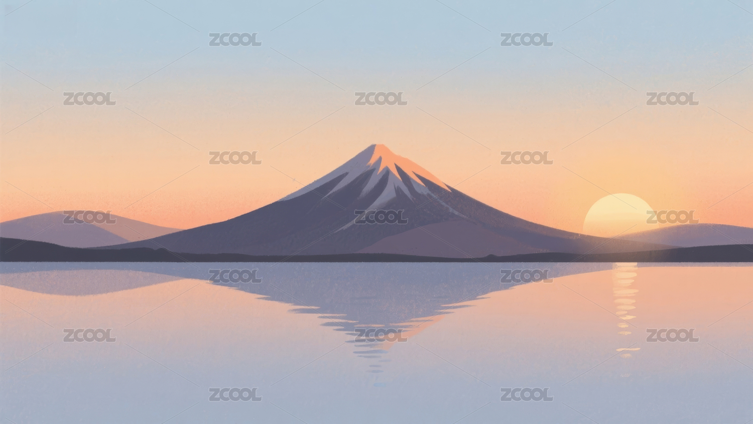 粉调,富士山,湖泊,风景,插画,设计,艺术,日本,山峰,日落