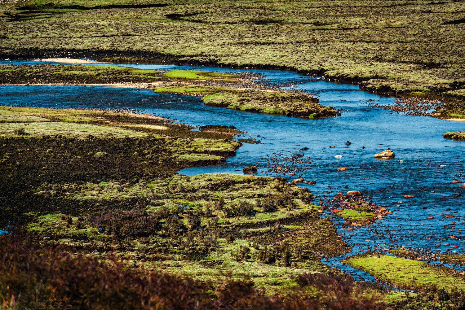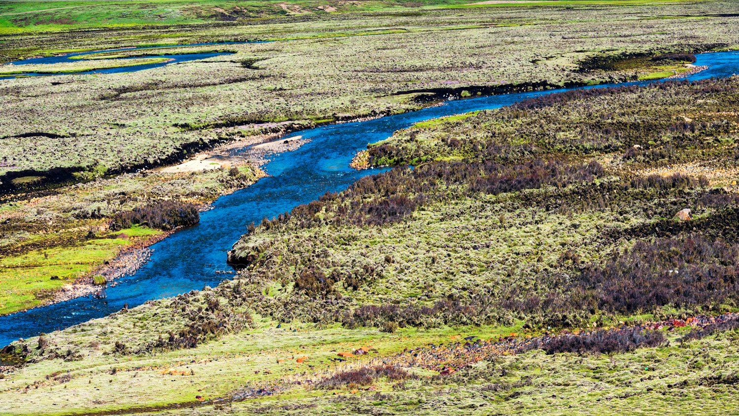 草原上崎岖蜿蜒的蓝色河流,牛羊吃草