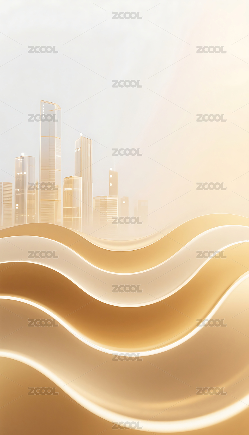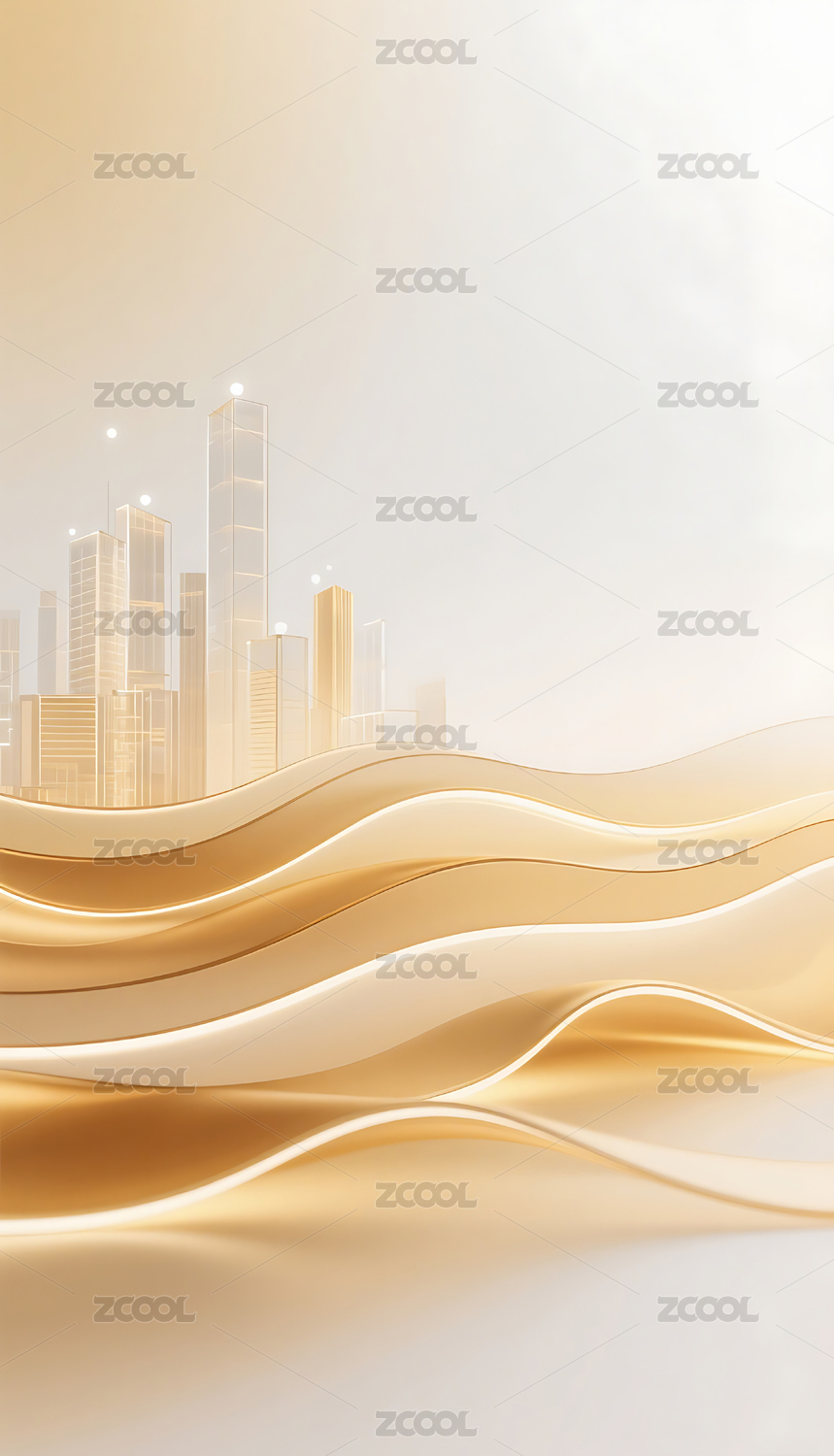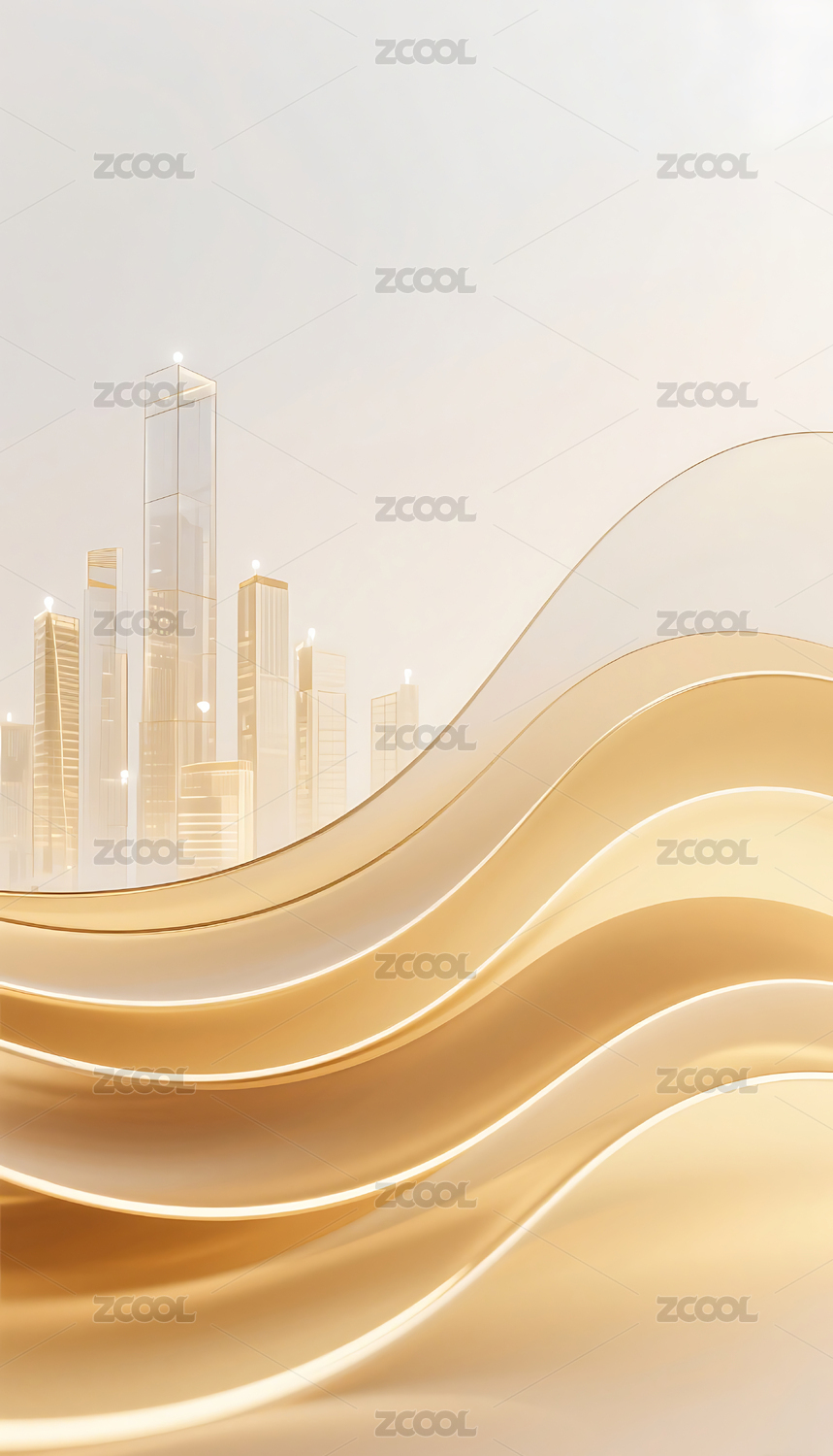 流畅的金色渐变波浪线条玻璃城市建筑
