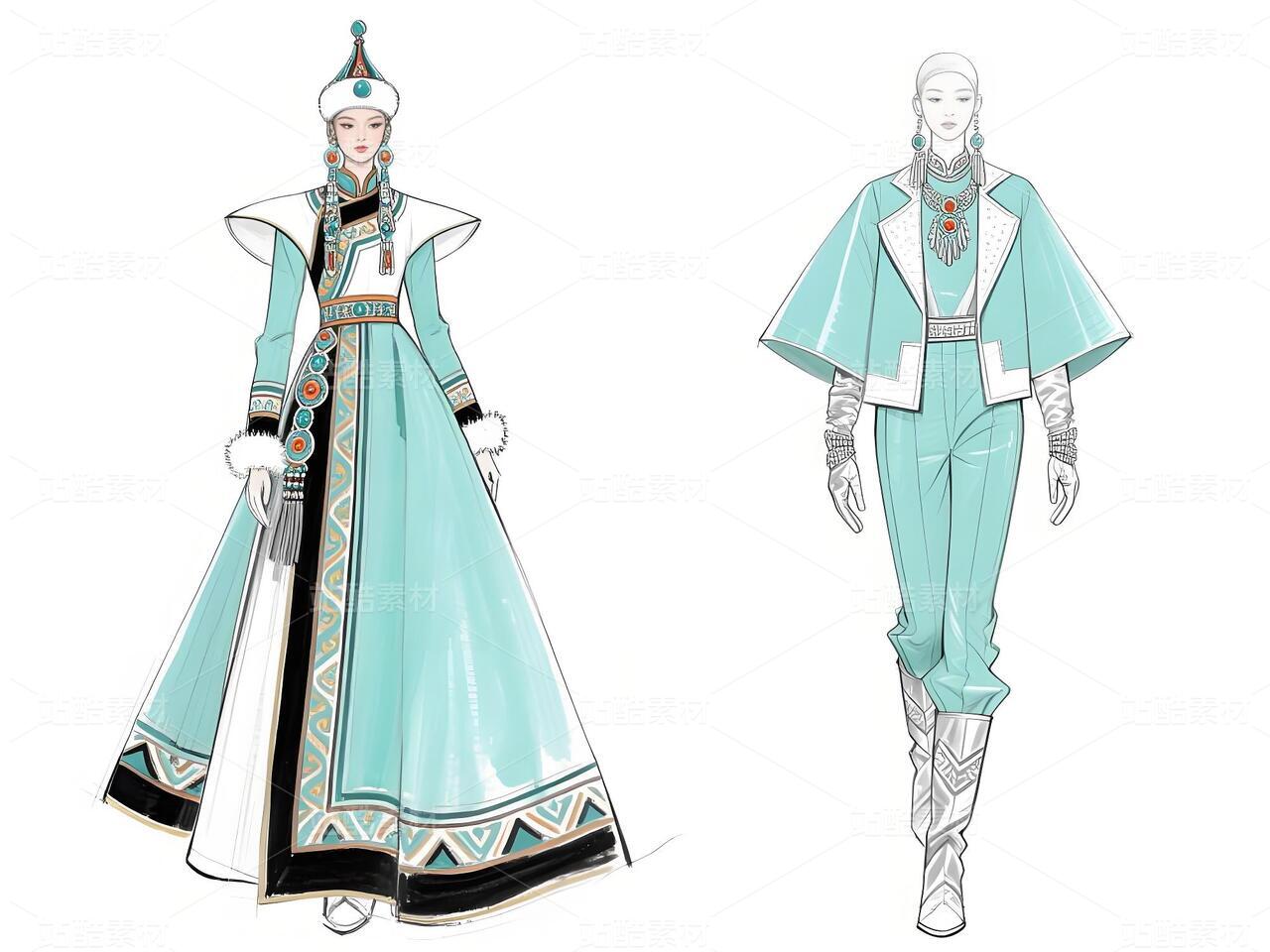 本系列以鄂伦春民族文化遗产为灵感,主打浅青色礼服与银白色外套,搭配精细的民族纹样刺绣与鹿角图腾配饰。服装采用不对称剪裁与流苏细节,呼应狩猎文化的自由精神;色彩上以冷色调为主,点缀暖色图案,形成鲜明对比。材质融合传统毛皮与现代光泽面料,配以骨质装饰、珠串手套及皮靴,既保留民族符号,又契合当代高定美学。设计旨在通过时尚语言传递鄂伦春人与自然的共生哲学,赋予古老技艺新的生命力。