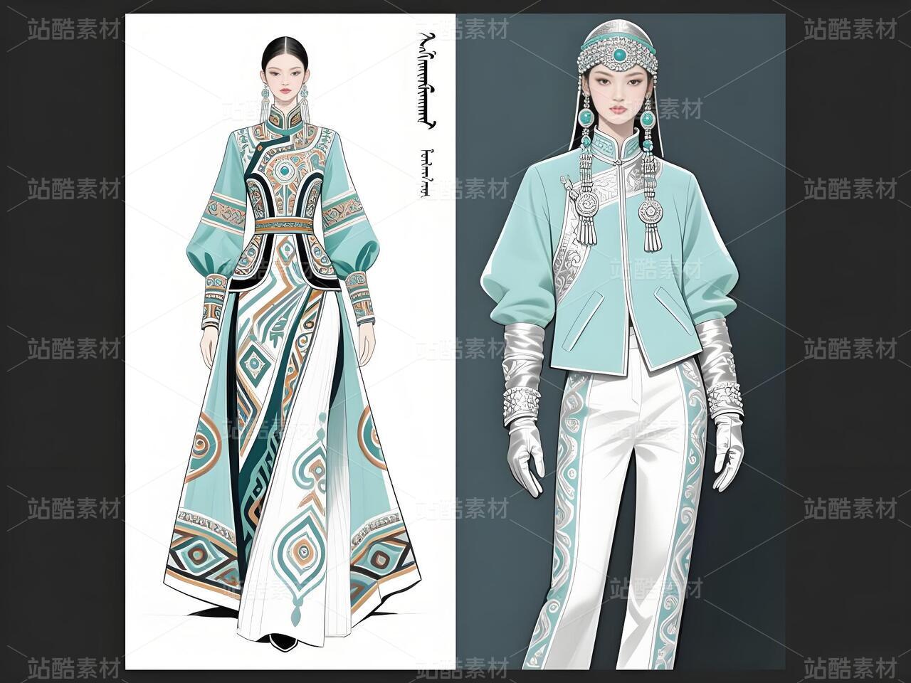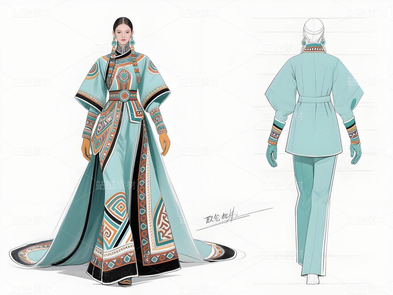 本系列以鄂伦春民族文化遗产为灵感,主打浅青色礼服与银白色外套,搭配精细的民族纹样刺绣与鹿角图腾配饰。服装采用不对称剪裁与流苏细节,呼应狩猎文化的自由精神;色彩上以冷色调为主,点缀暖色图案,形成鲜明对比。材质融合传统毛皮与现代光泽面料,配以骨质装饰、珠串手套及皮靴,既保留民族符号,又契合当代高定美学。设计旨在通过时尚语言传递鄂伦春人与自然的共生哲学,赋予古老技艺新的生命力。