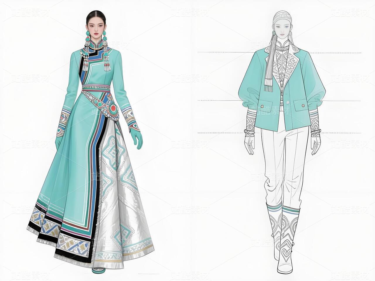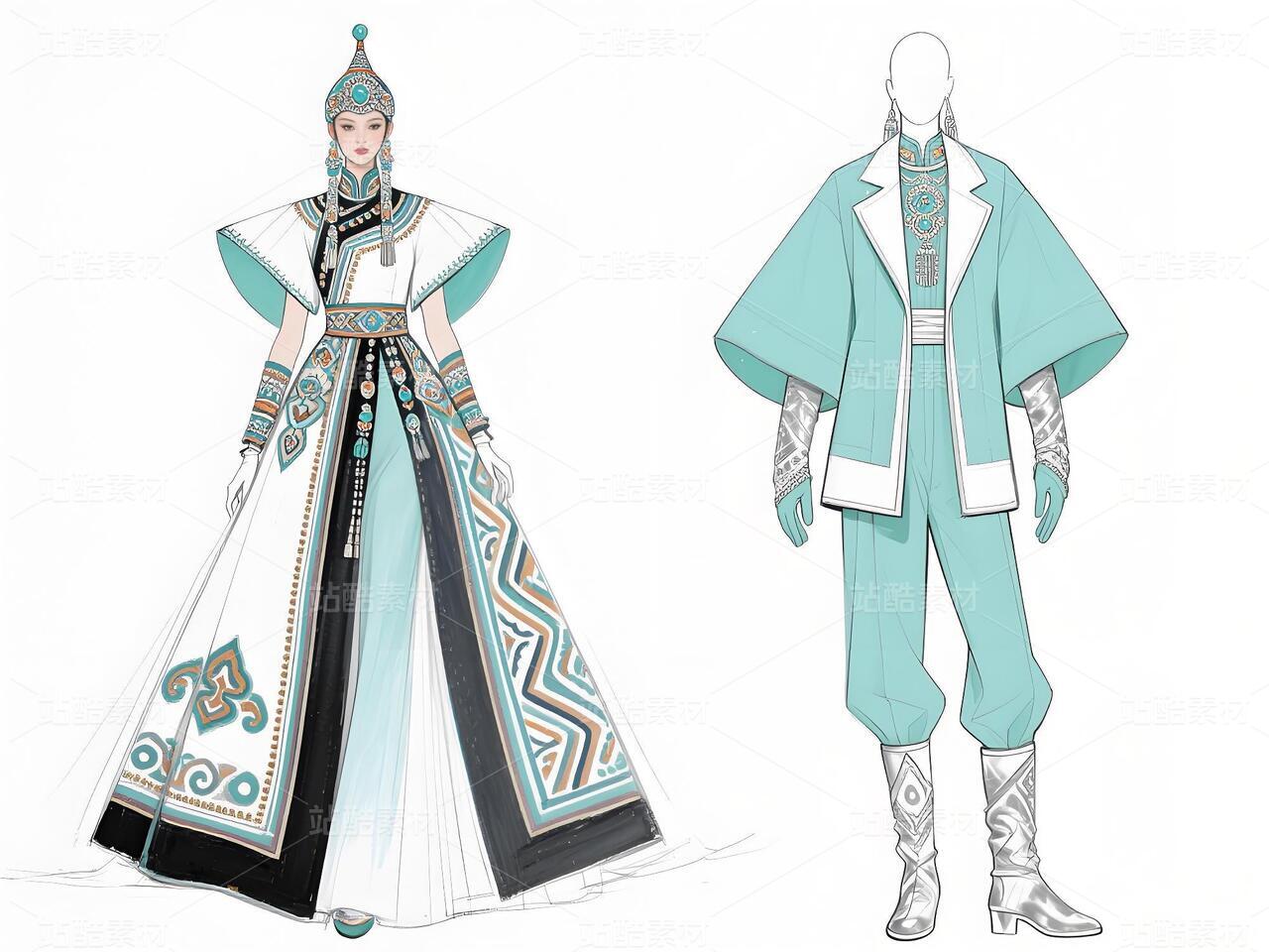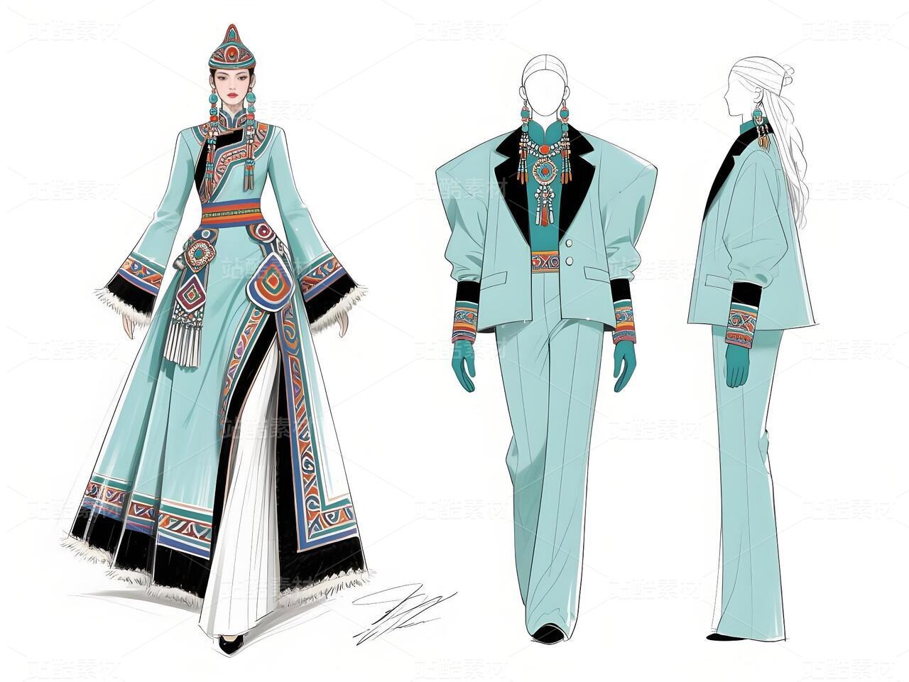 本系列以鄂伦春民族文化遗产为灵感,主打浅青色礼服与银白色外套,搭配精细的民族纹样刺绣与鹿角图腾配饰。服装采用不对称剪裁与流苏细节,呼应狩猎文化的自由精神;色彩上以冷色调为主,点缀暖色图案,形成鲜明对比。材质融合传统毛皮与现代光泽面料,配以骨质装饰、珠串手套及皮靴,既保留民族符号,又契合当代高定美学。设计旨在通过时尚语言传递鄂伦春人与自然的共生哲学,赋予古老技艺新的生命力。