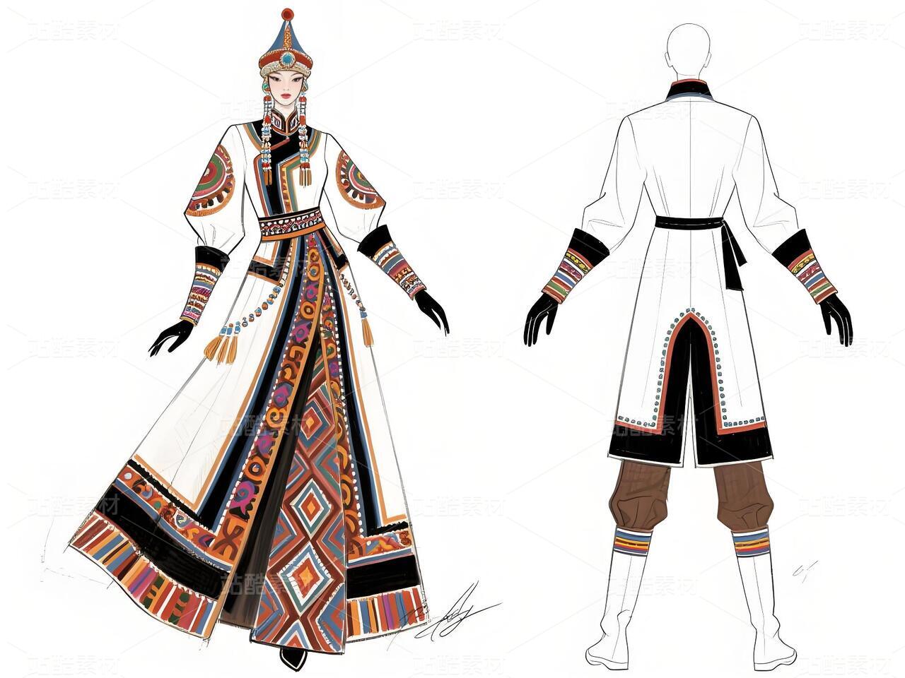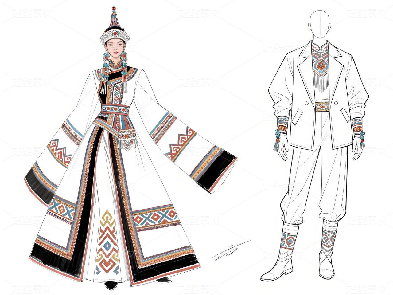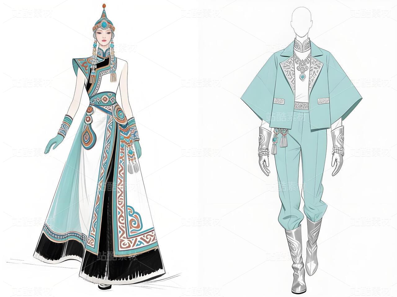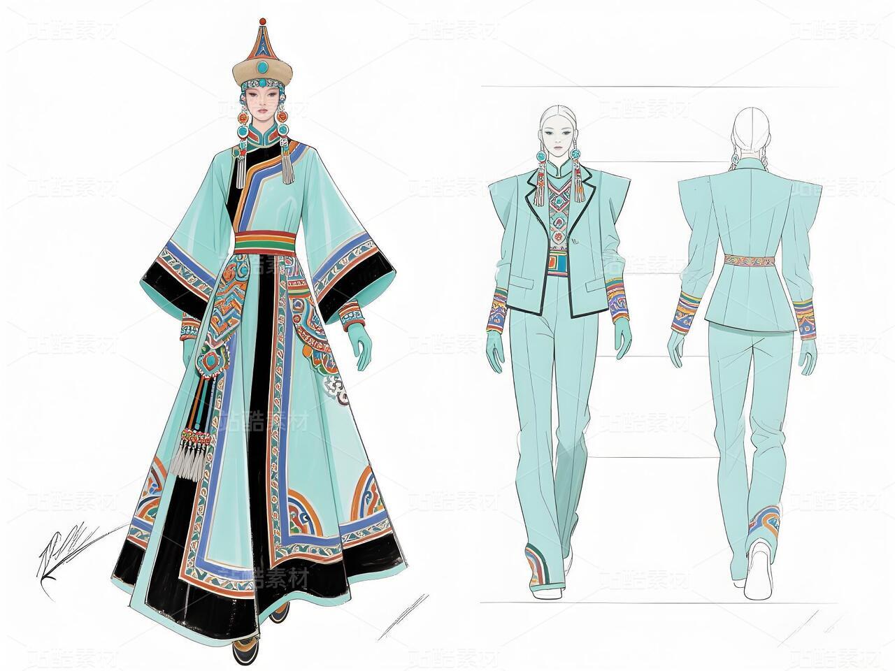 本系列以鄂伦春民族文化遗产为灵感,主打浅青色礼服与银白色外套,搭配精细的民族纹样刺绣与鹿角图腾配饰。服装采用不对称剪裁与流苏细节,呼应狩猎文化的自由精神;色彩上以冷色调为主,点缀暖色图案,形成鲜明对比。材质融合传统毛皮与现代光泽面料,配以骨质装饰、珠串手套及皮靴,既保留民族符号,又契合当代高定美学。设计旨在通过时尚语言传递鄂伦春人与自然的共生哲学,赋予古老技艺新的生命力。