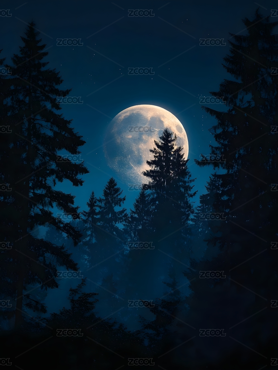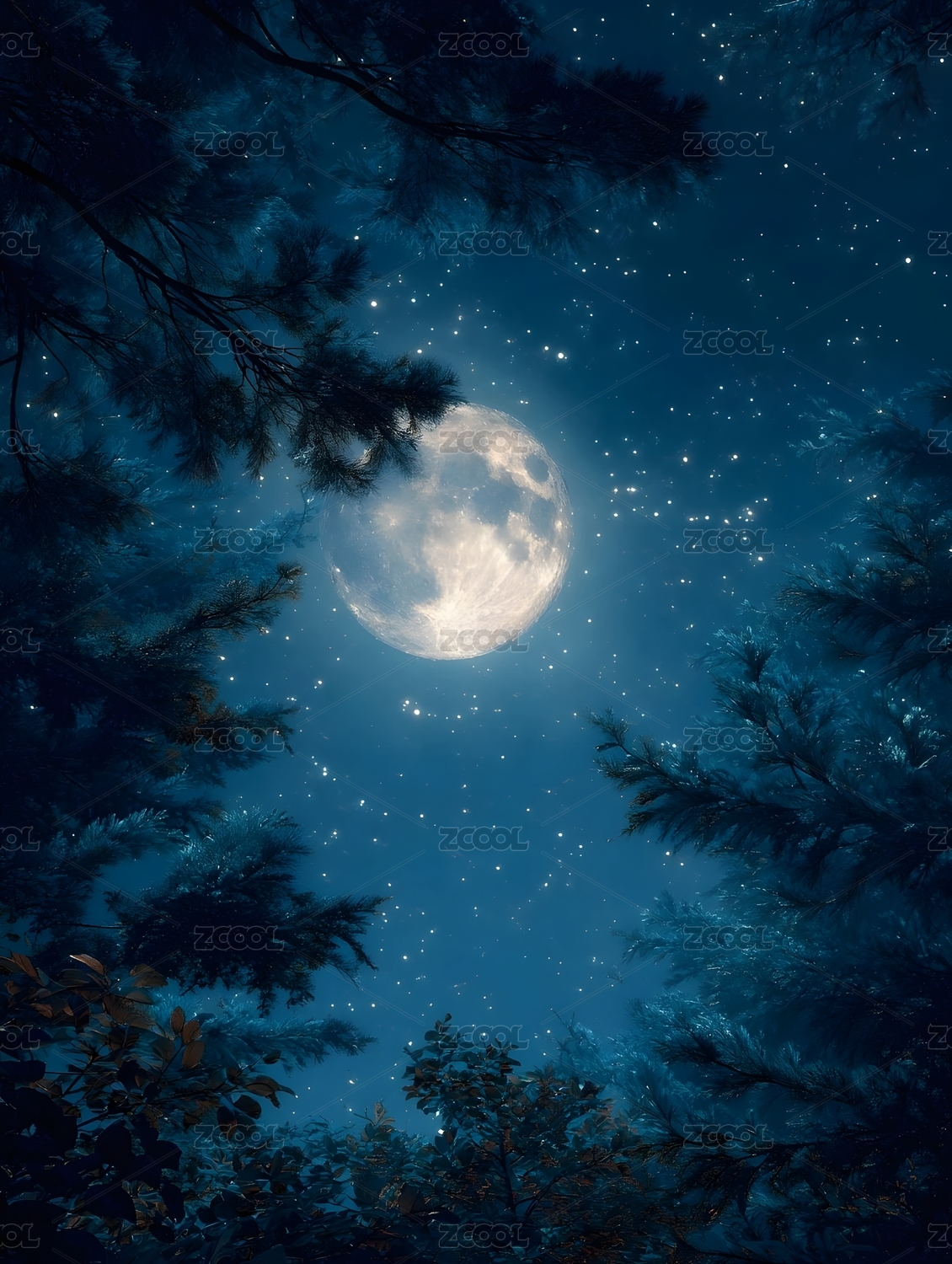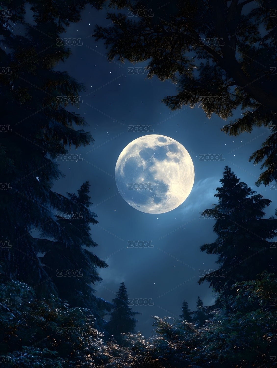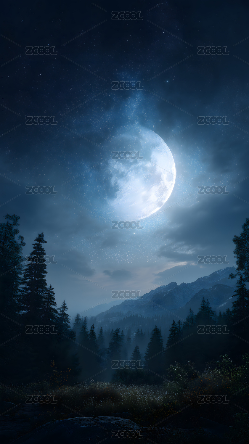满月,星空,夜景,森林,树木,夜晚,宁静,唯美,自然,夜空