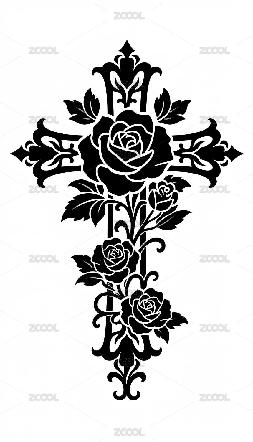 黑色哥特式玫瑰十字架纹身图案