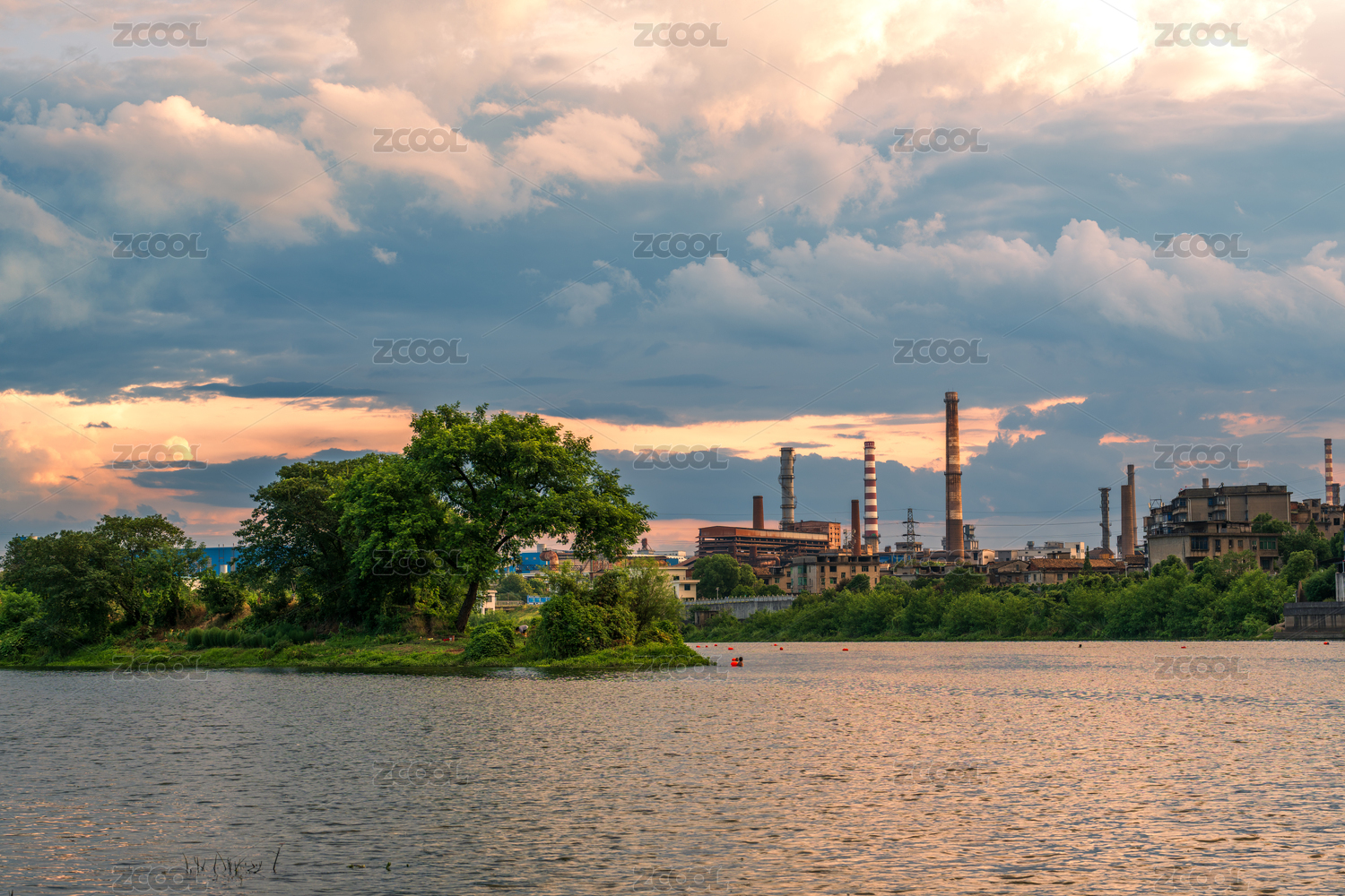 被淹没的江滩和发电厂冒着浓烟的烟囱
