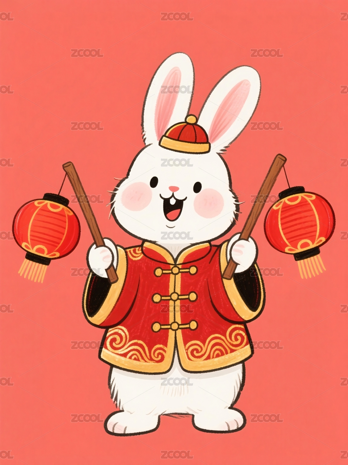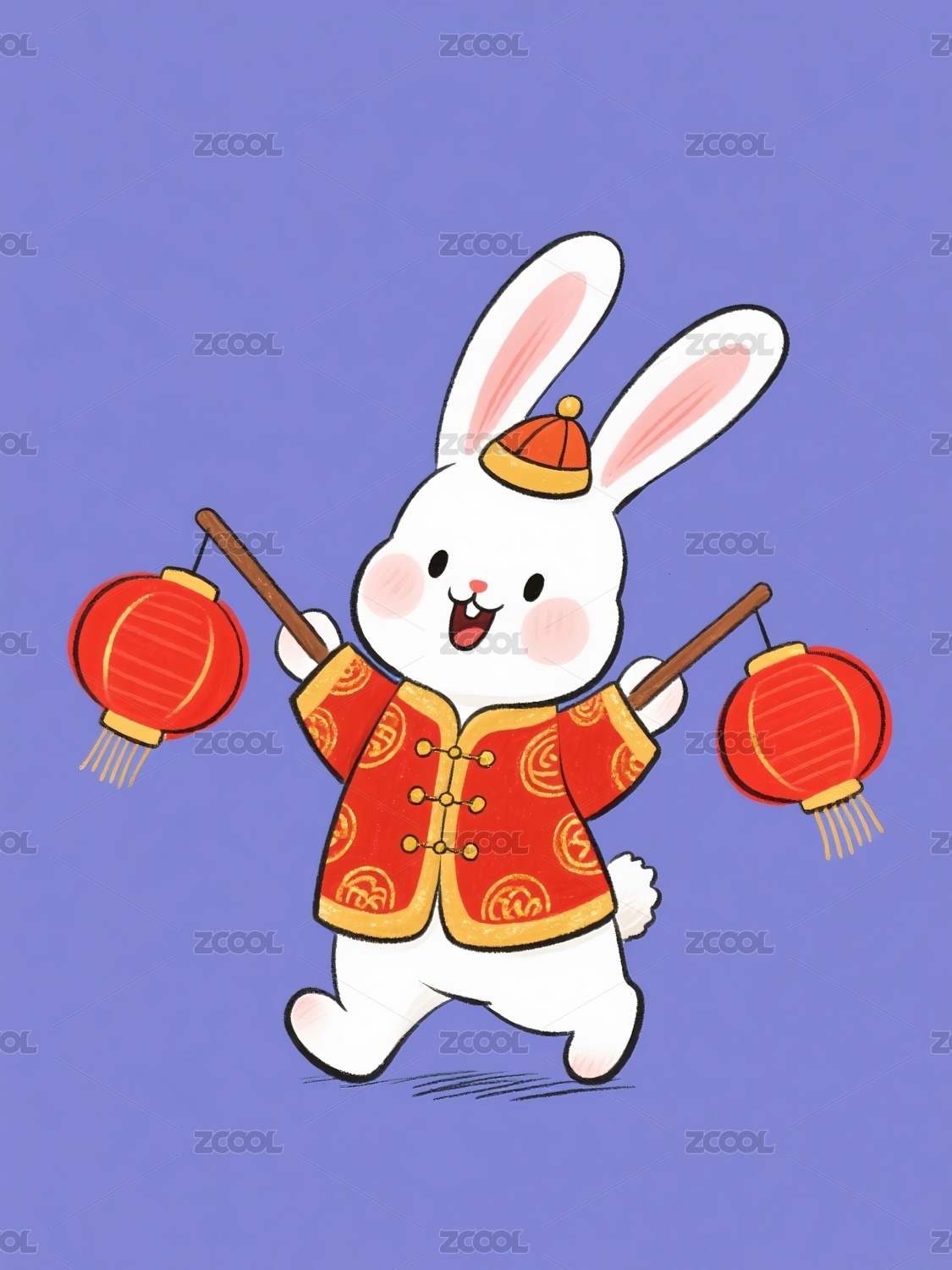 兔年穿着喜庆服饰手持灯笼