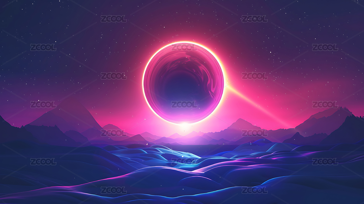 电蓝紫流形山脉与日出科幻景观