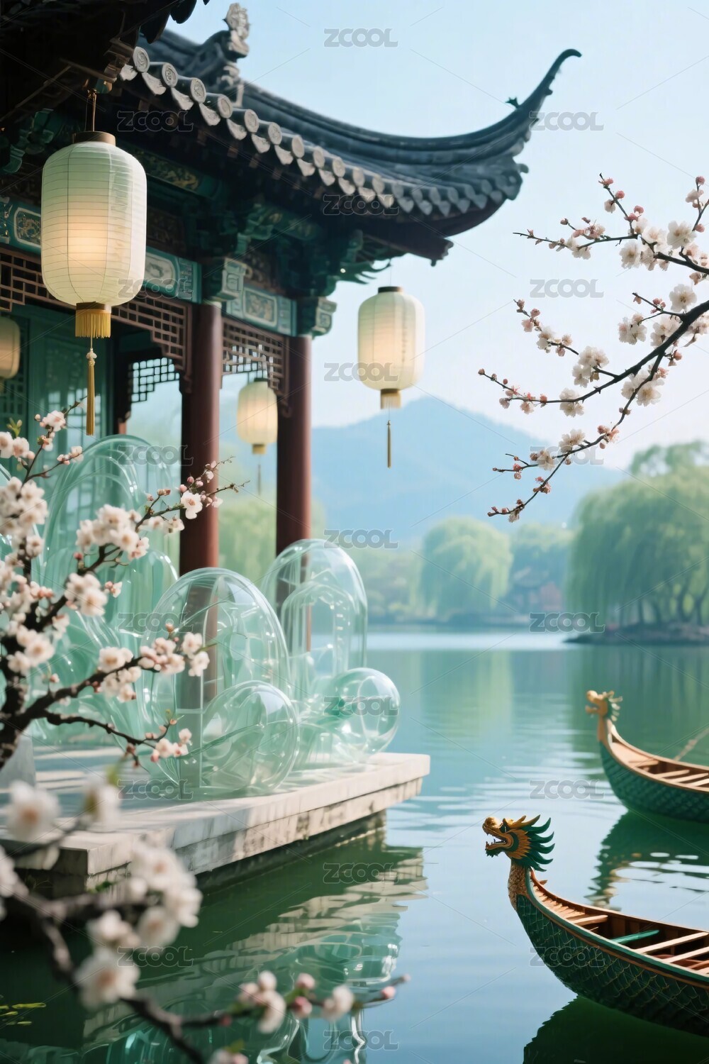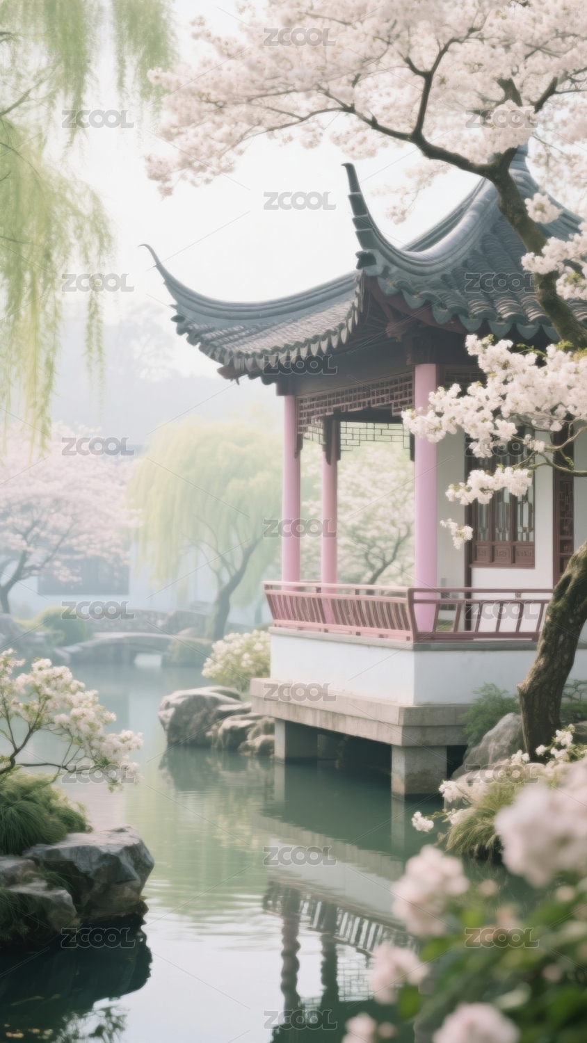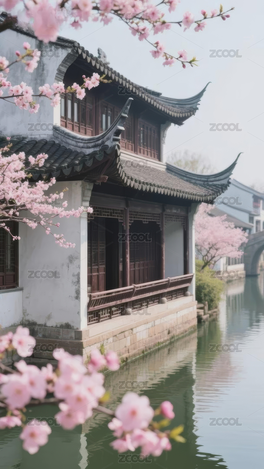水边,古宅,樱花,映衬,夜景,灯光,温暖,木质,建筑,传统