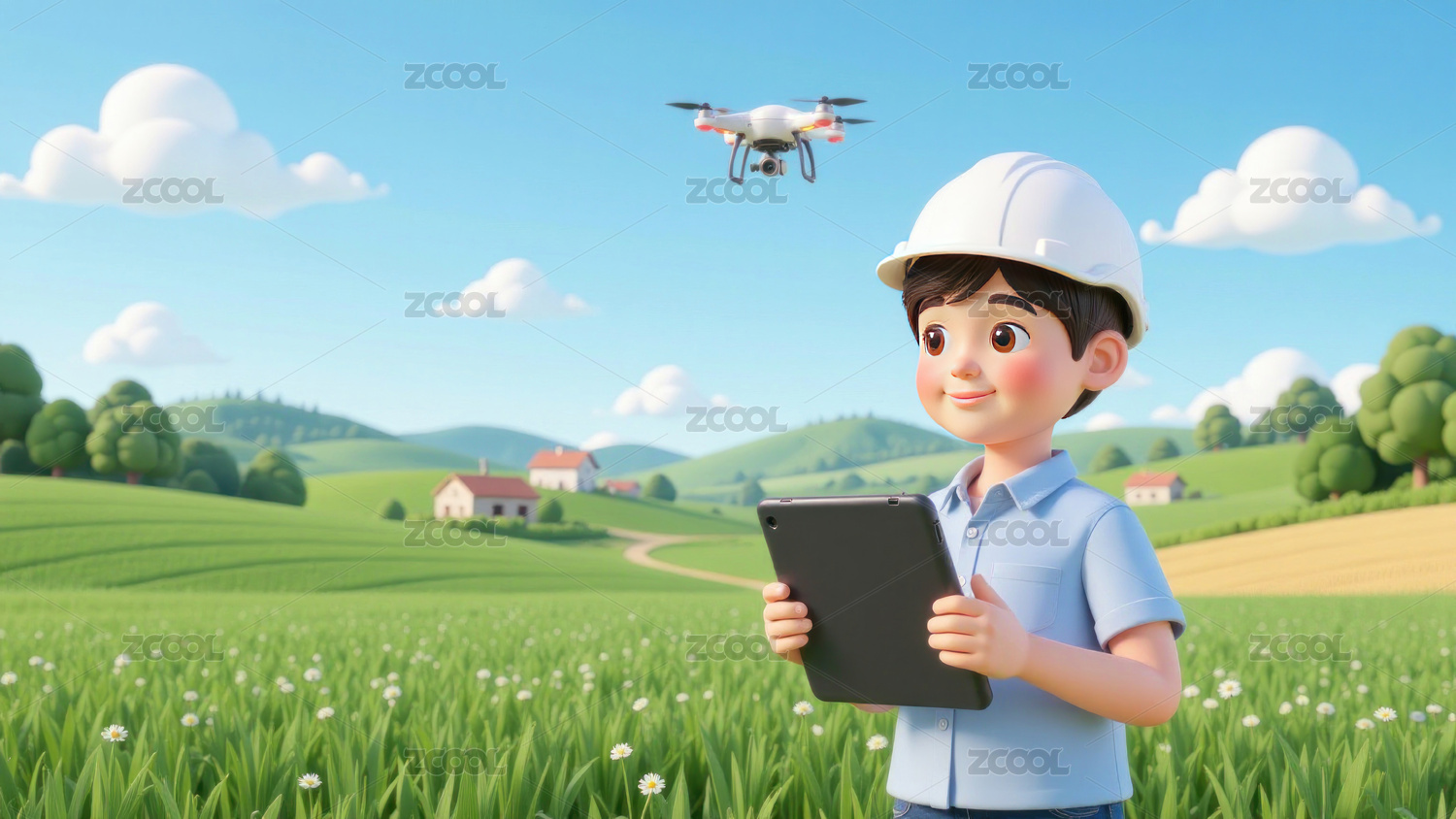男孩在田野使用无人机和电子平板