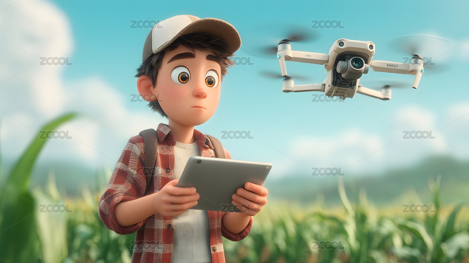 农场男孩操控无人机田野 阳光明媚