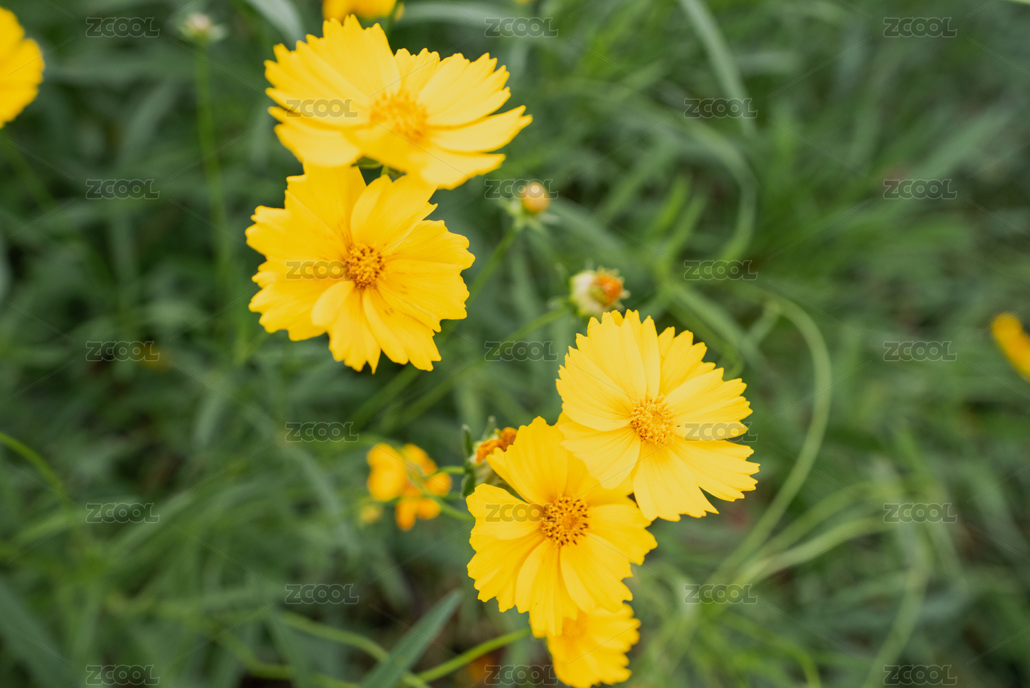 颜色艳黄,在草丛中怒放的金鸡菊