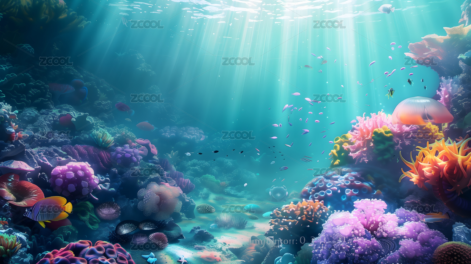充满彩色水母和珊瑚礁的美丽海底世界