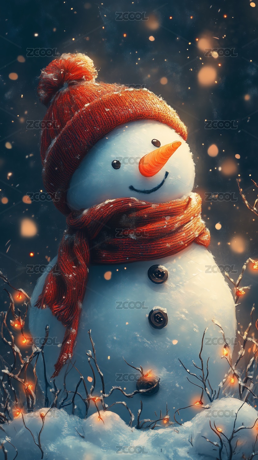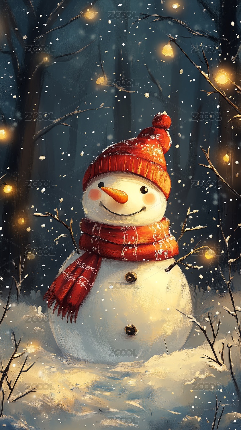 雪夜红帽雪人冬日暖意