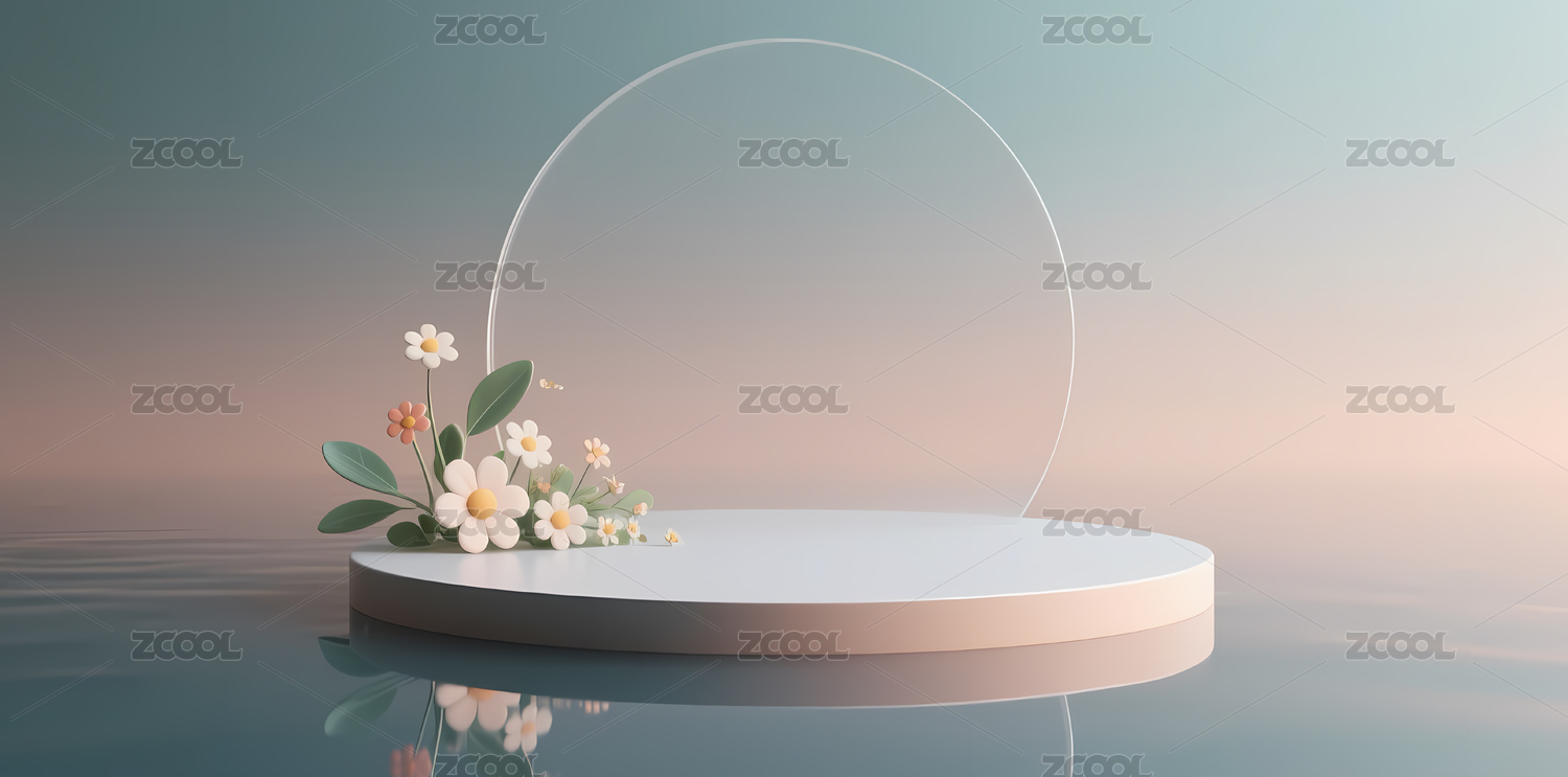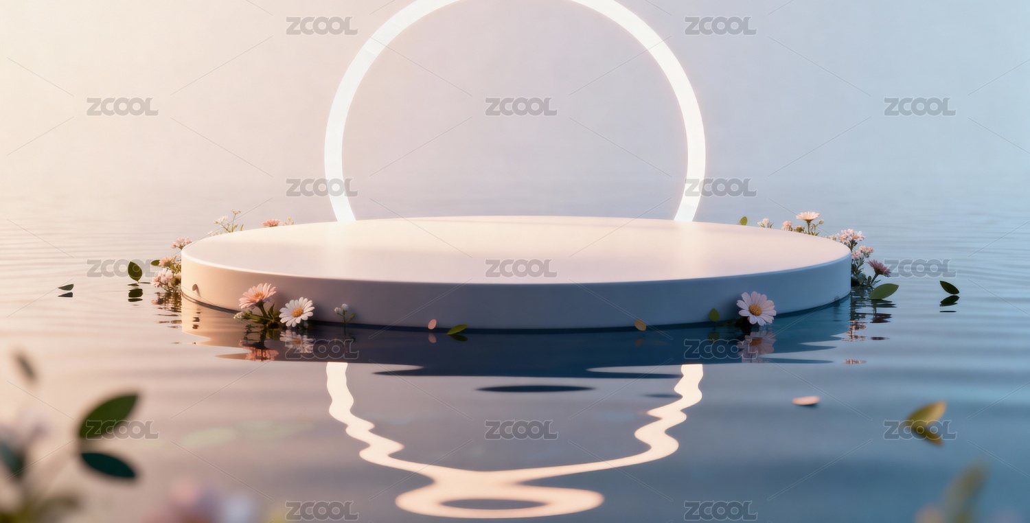 光影效果,极简风格,白色背景,圆形平台,花卉装饰,水面倒影,弧形线条,简洁设计,自然元素,静谧氛围