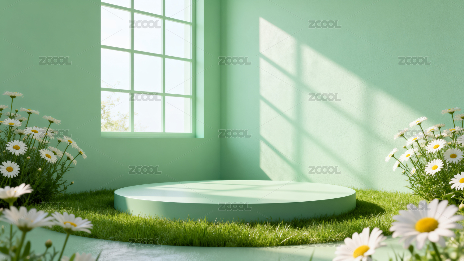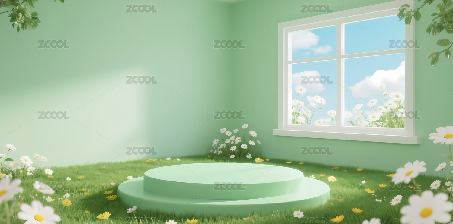 绿色室内场景,窗边花丛与圆形平台
