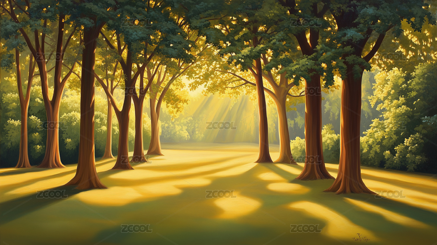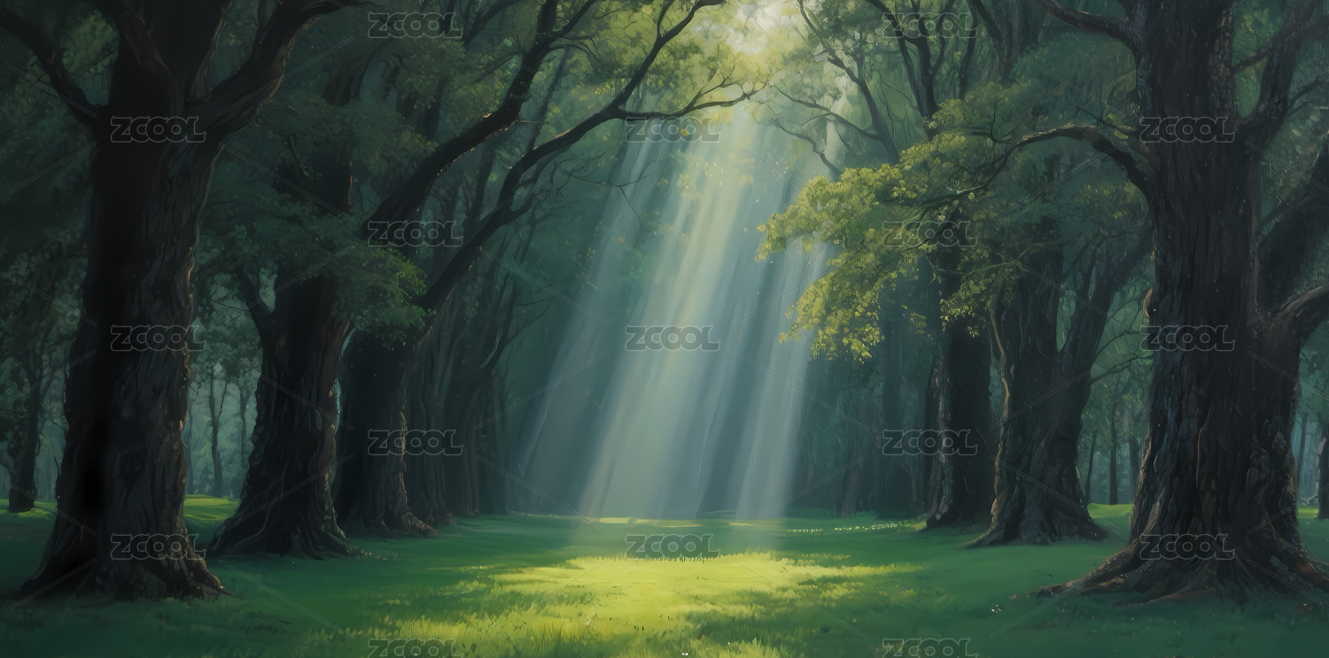 阳光穿透绿色森林插画
