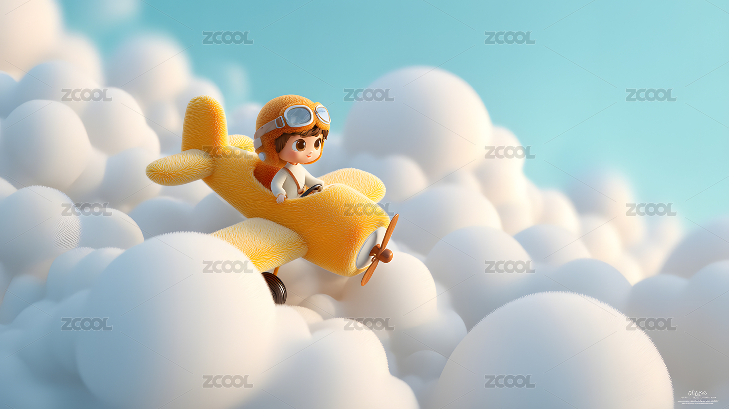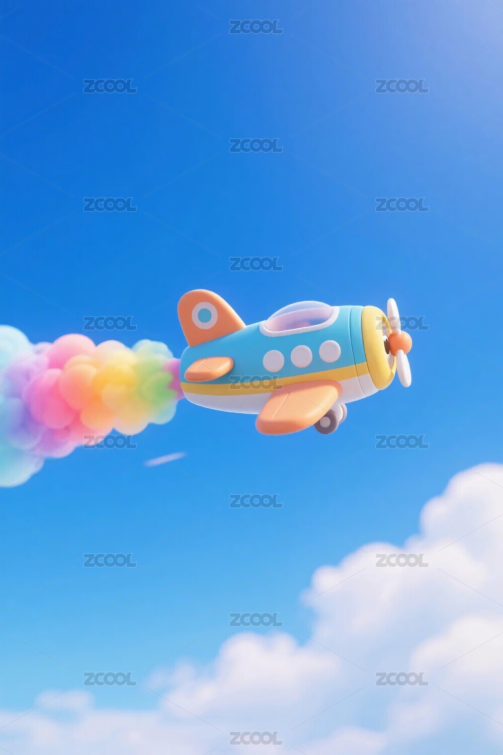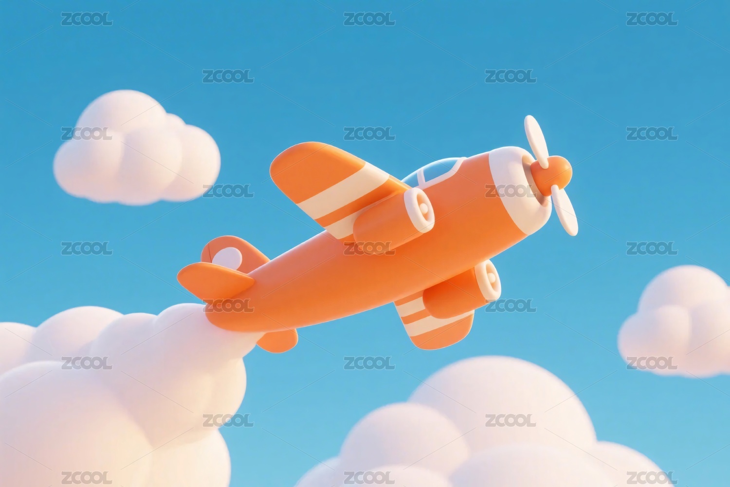 飞机,飞行,黄色,螺旋桨,白云,蓝天,3D,插图,卡通,玩具