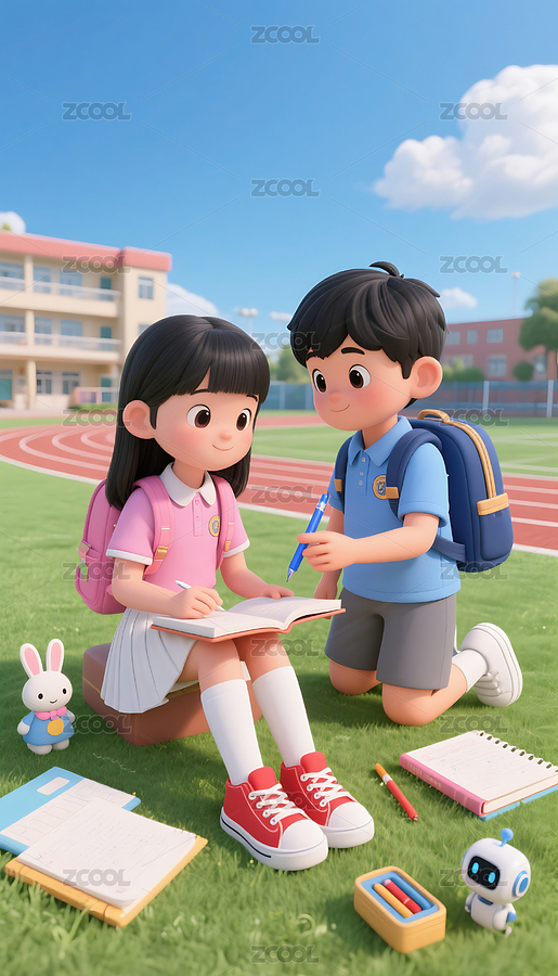 3D,学生,校园,学校,插画,开学季,模型,玩具,操场,草地