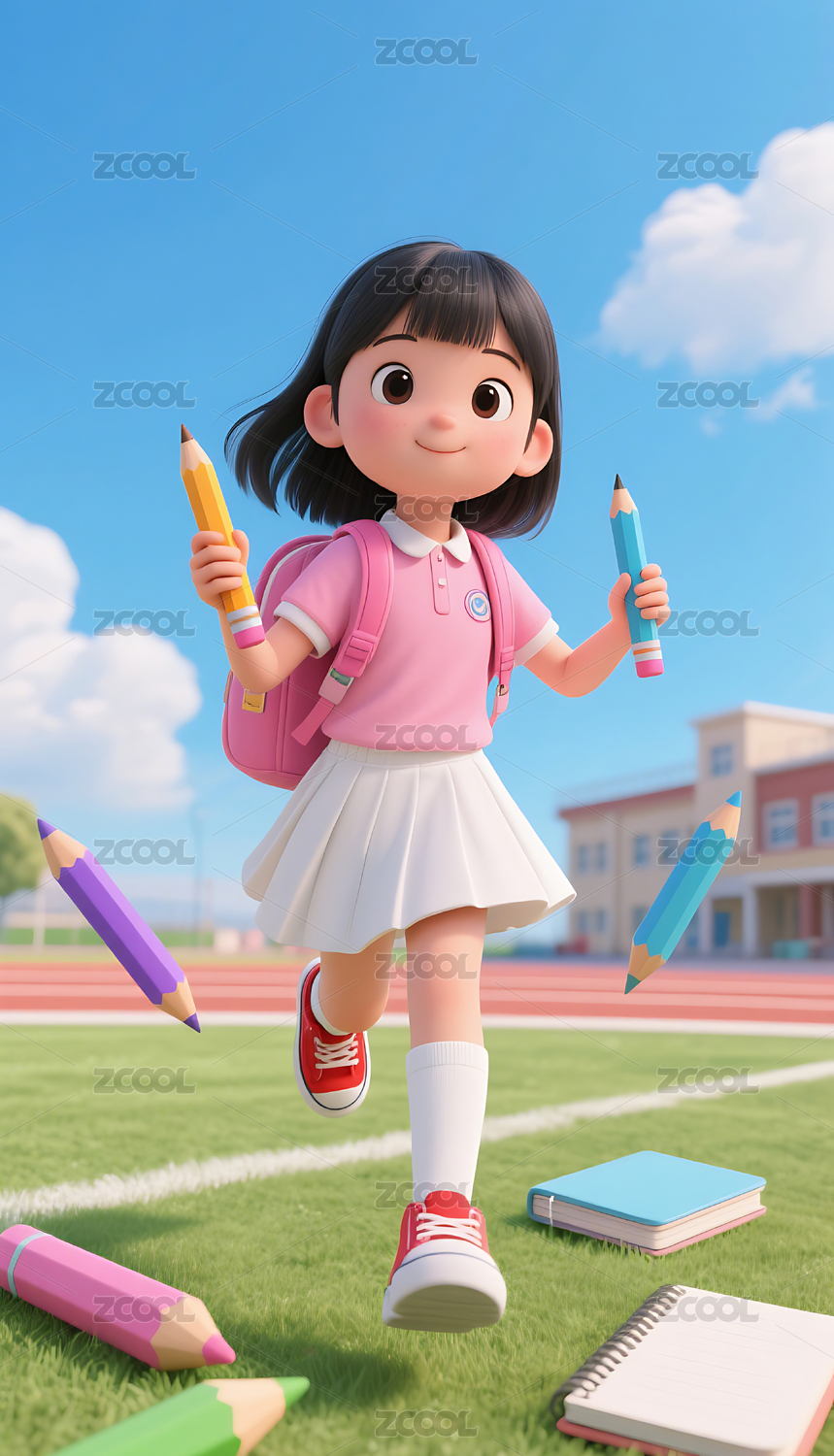 3D,学生,校园,学校,插画,开学季,模型,玩具,操场,草地