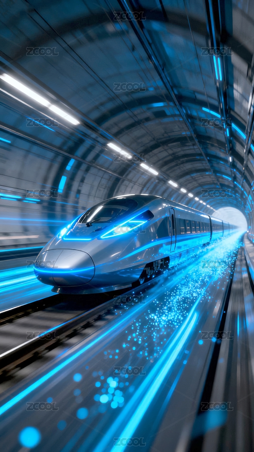 科技感,光影效果,夜景,未来感,未来城市,高楼大厦,铁轨,高速列车,霓虹灯光,轨道交通