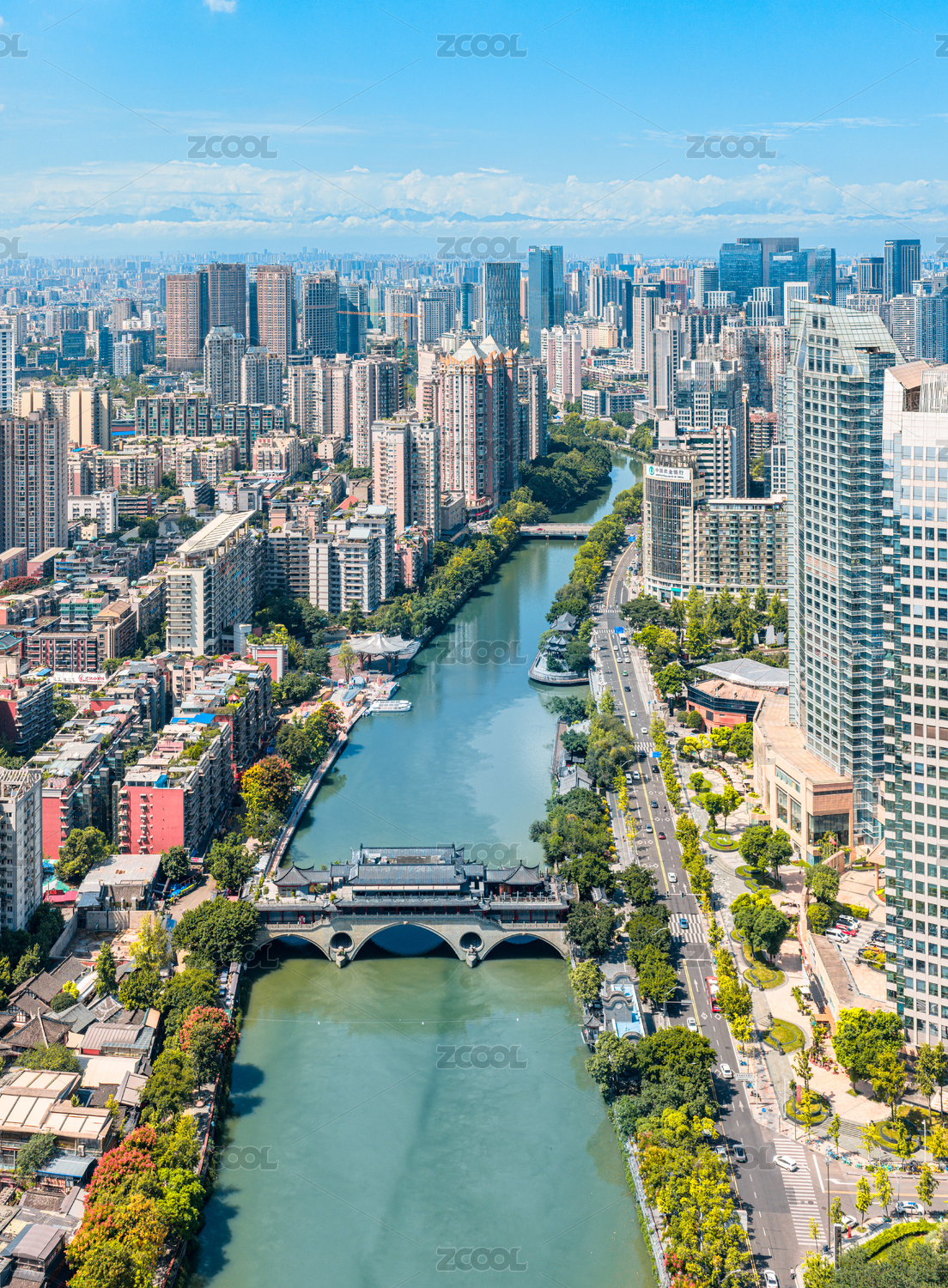 中国四川成都龙门山下锦江两岸城市建筑航拍