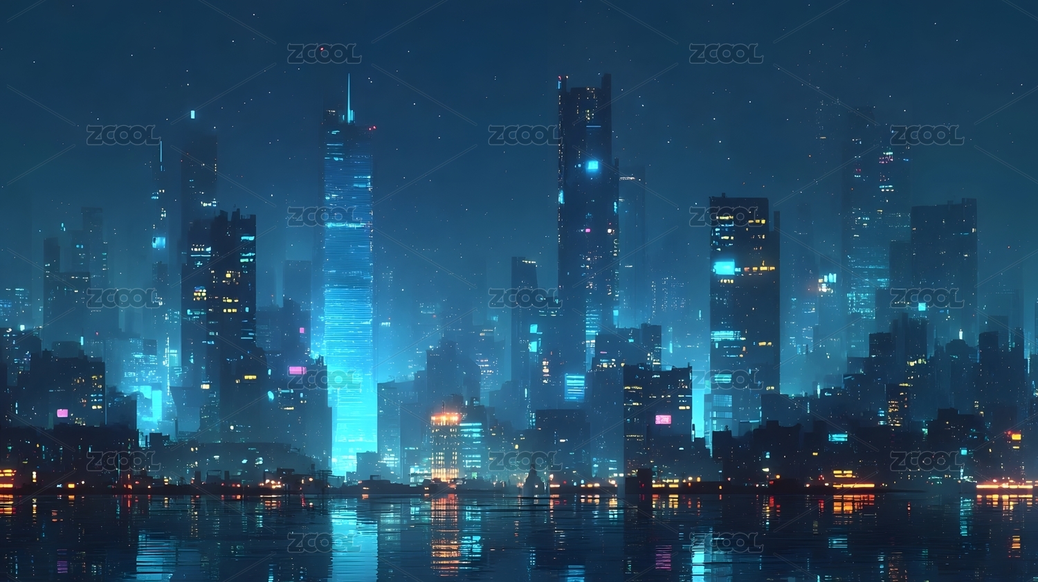 都市,未来,海滨,夜晚,光线,全息,轨迹,水面,天际线,高楼