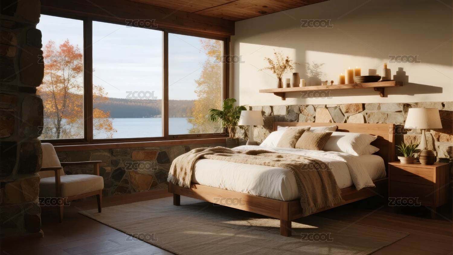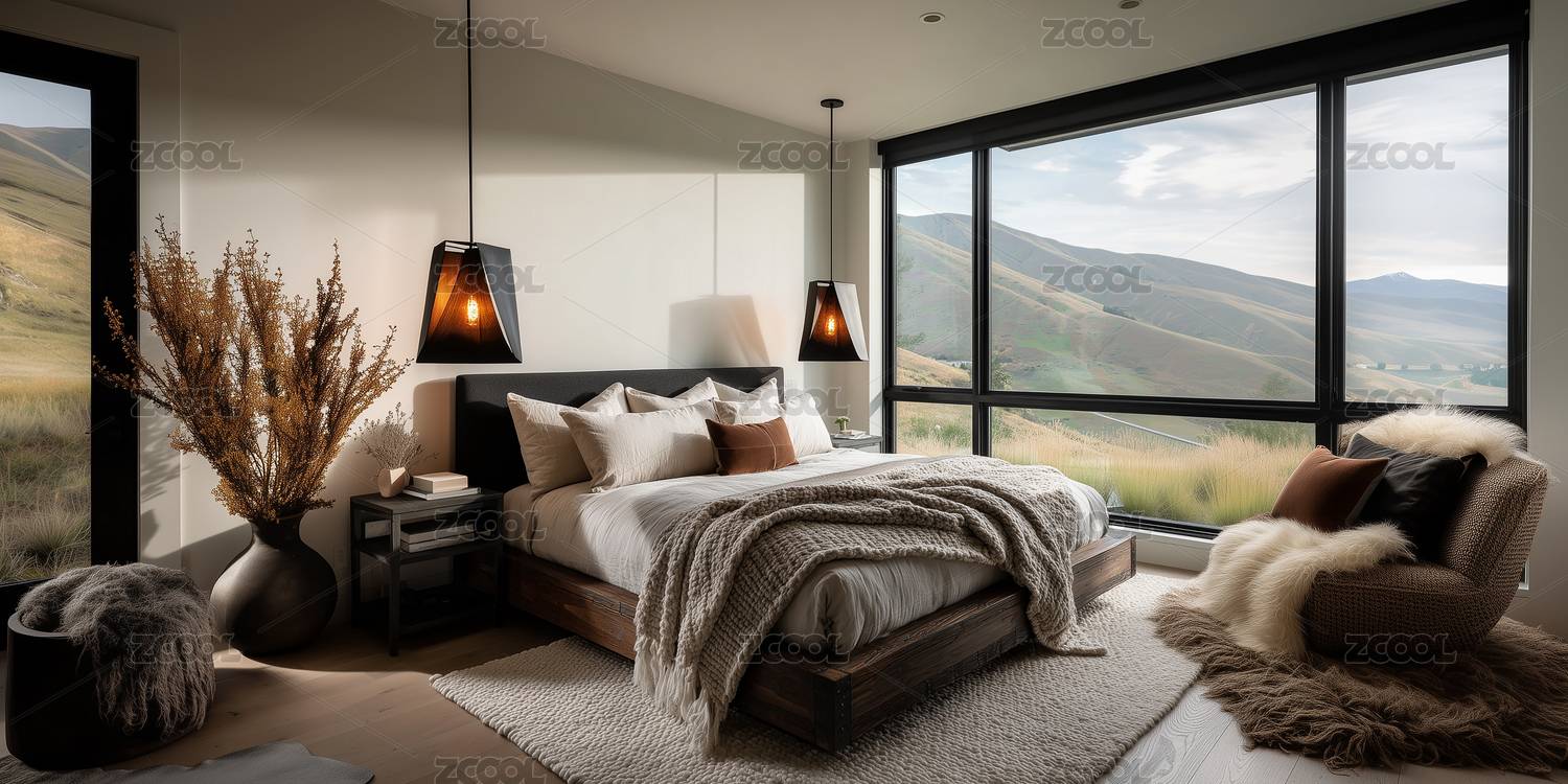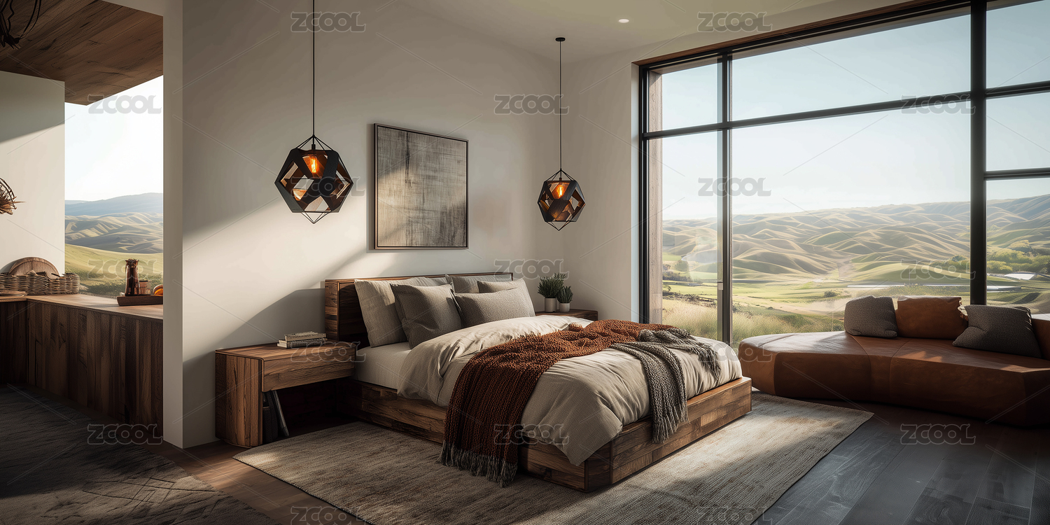 卧室,温馨,现代,床架,木质,深色,毯子,中性,色调,吊灯