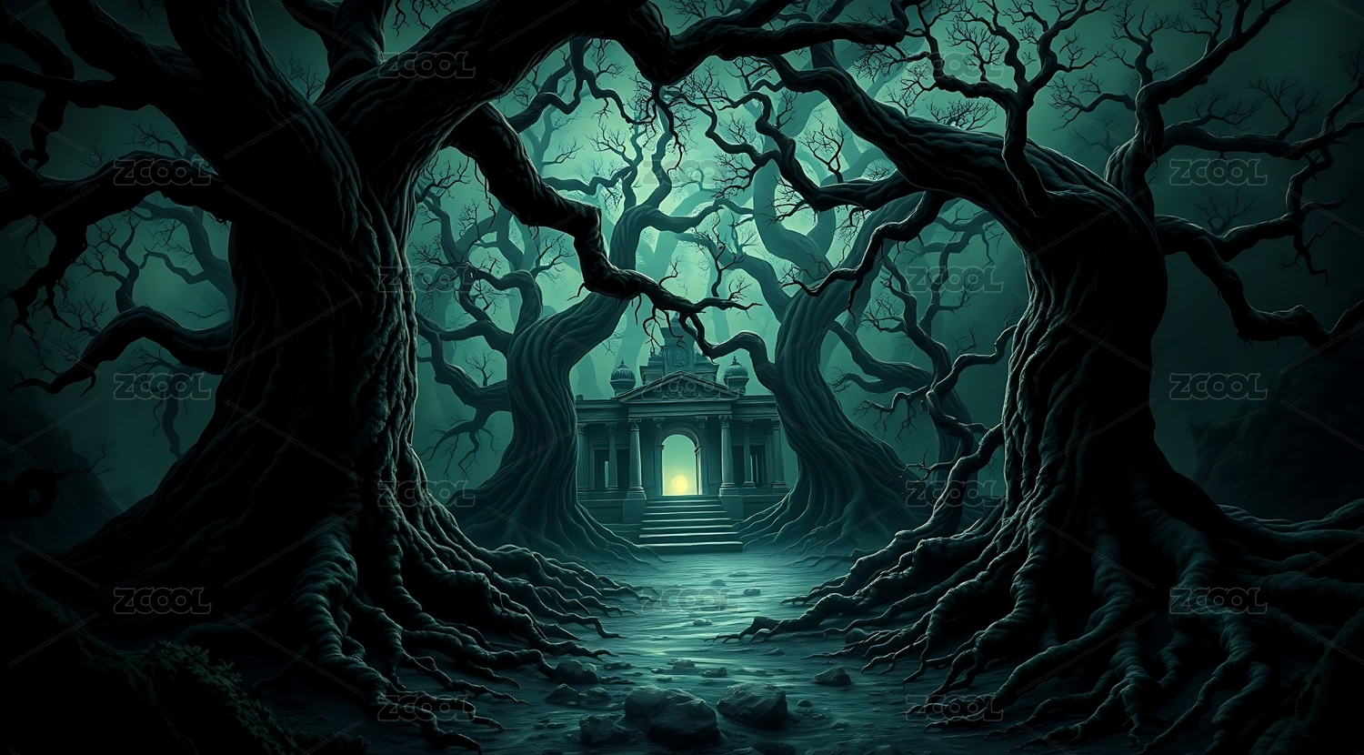 悬浮岛屿上的古老树木在闪电中屹立不倒