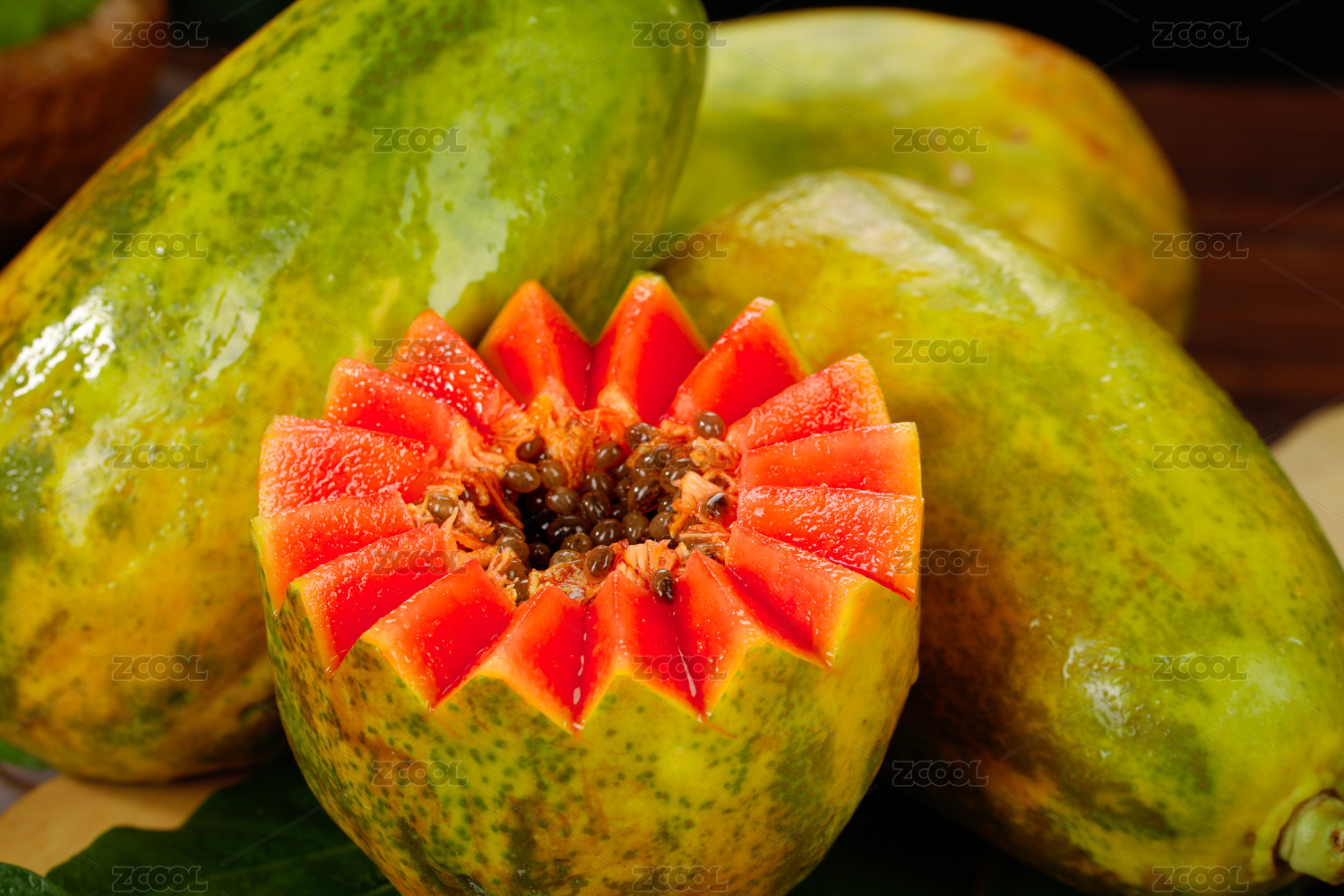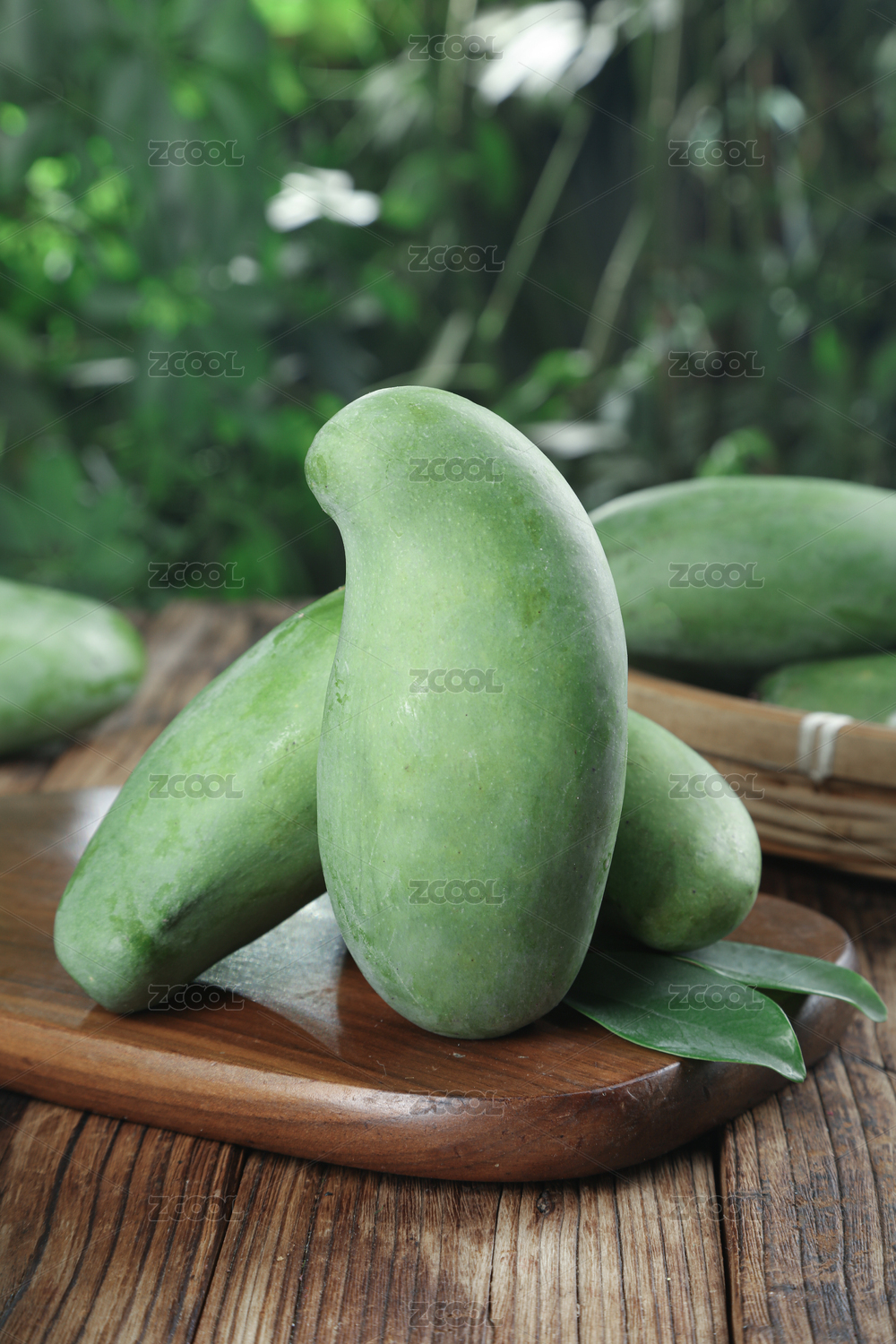 三角形格子布上木盘里放着新鲜的青皮芒果