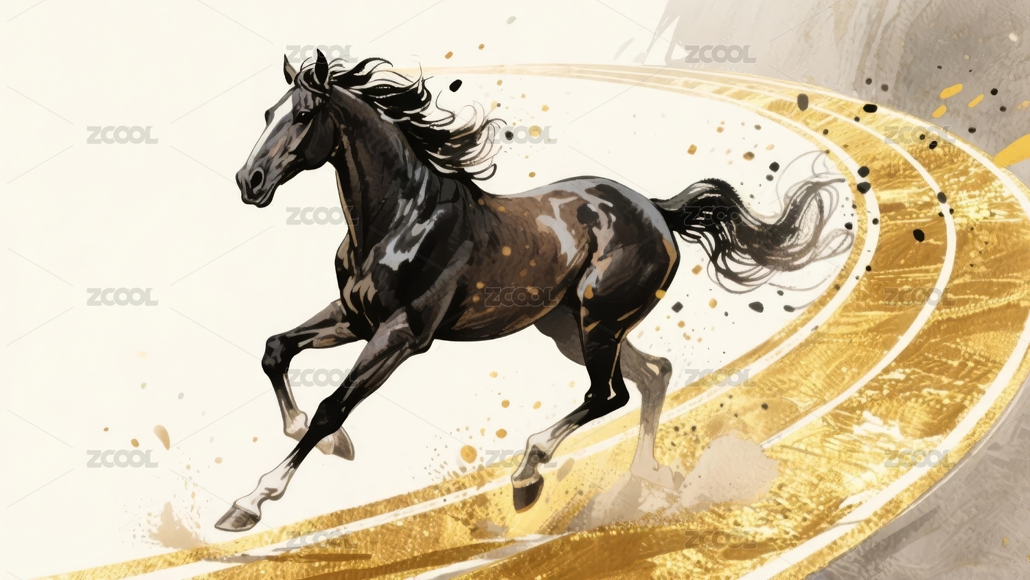奔腾的黑马在金色轨迹上