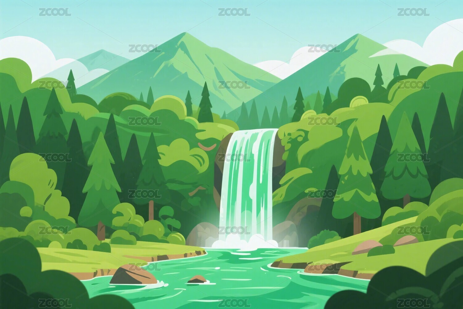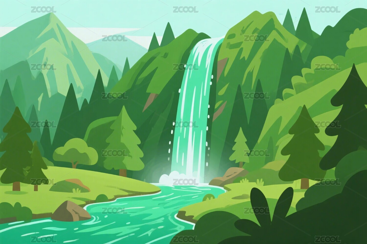 森林瀑布风景插画