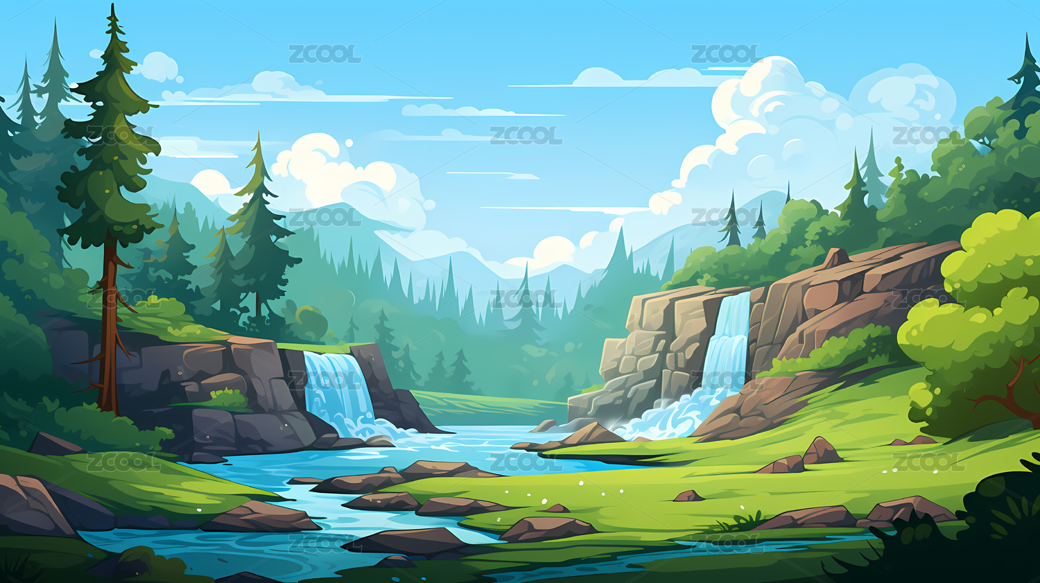 卡通森林中的瀑布插画
