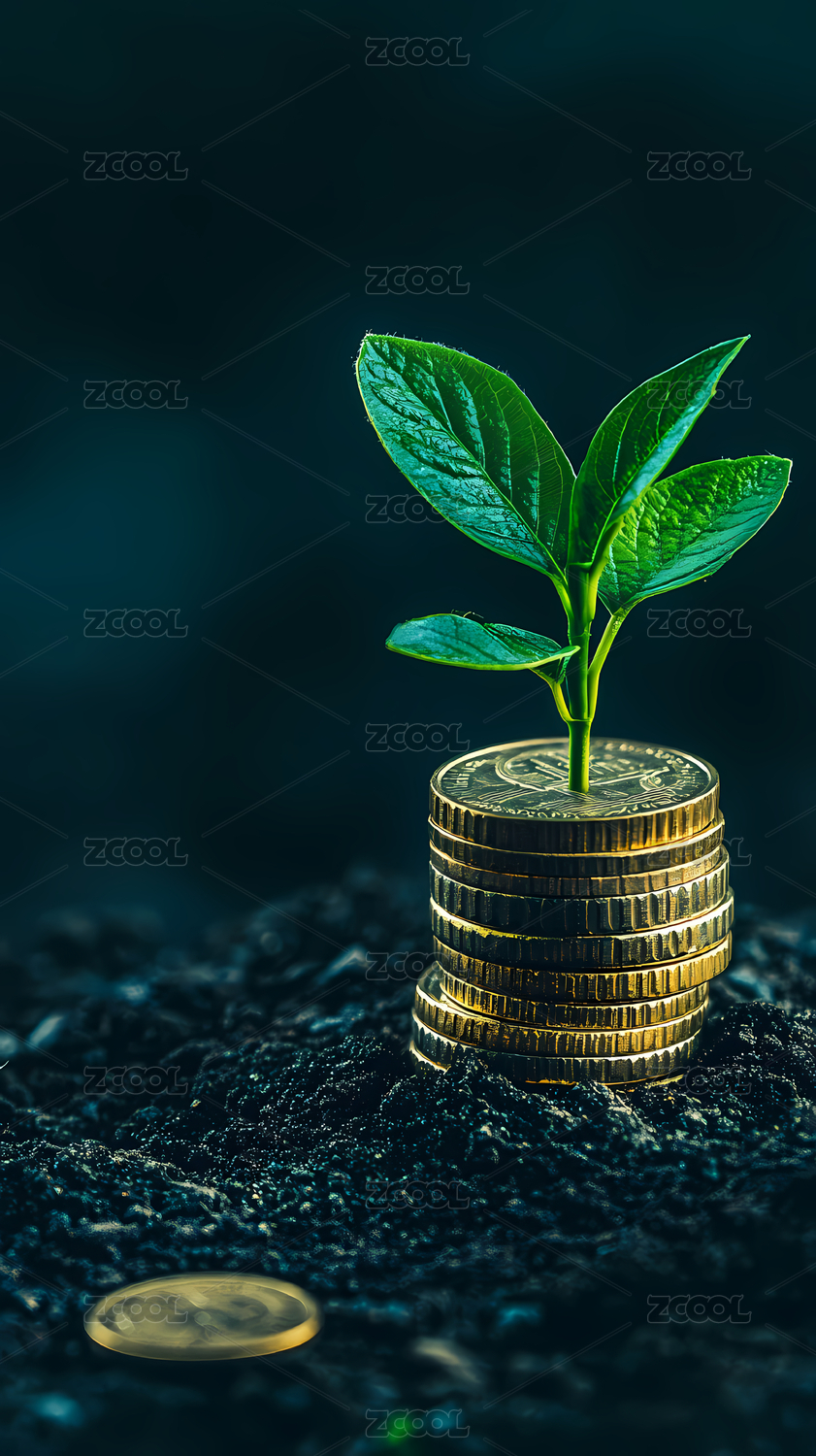 金币堆叠孕育绿植的财富成长