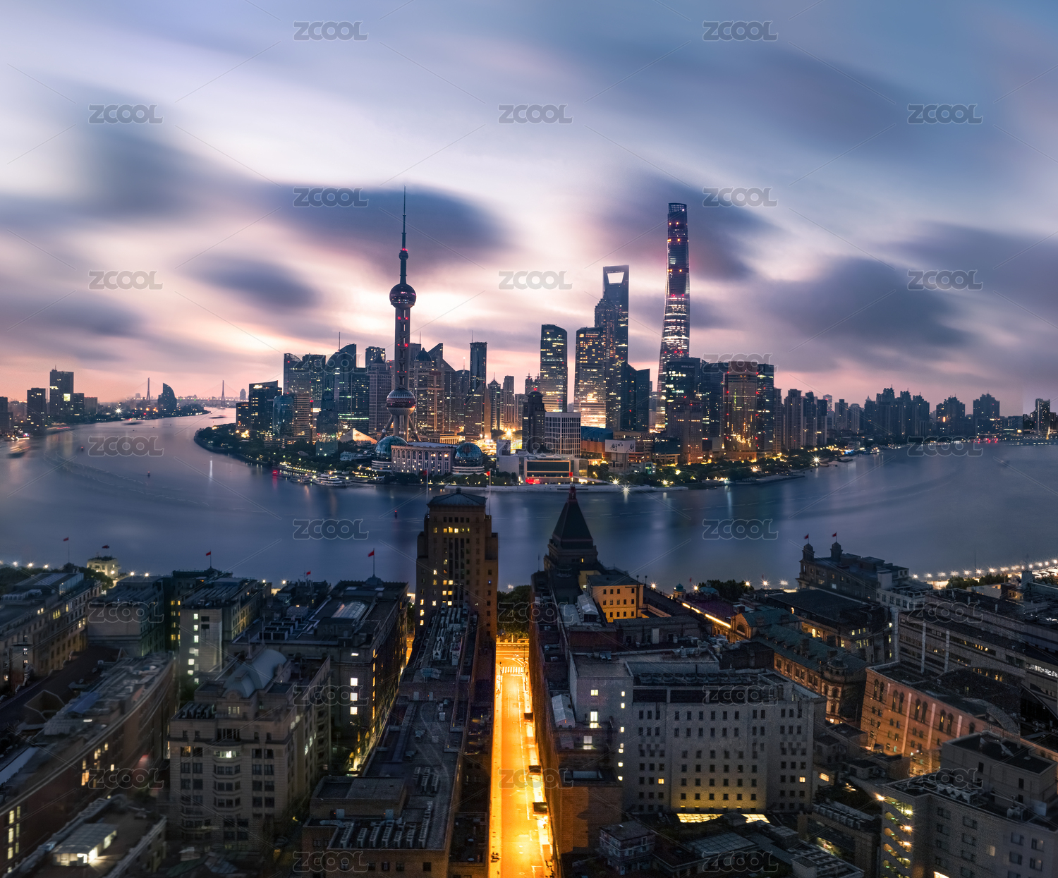 日出前的中国上海天际线全景图