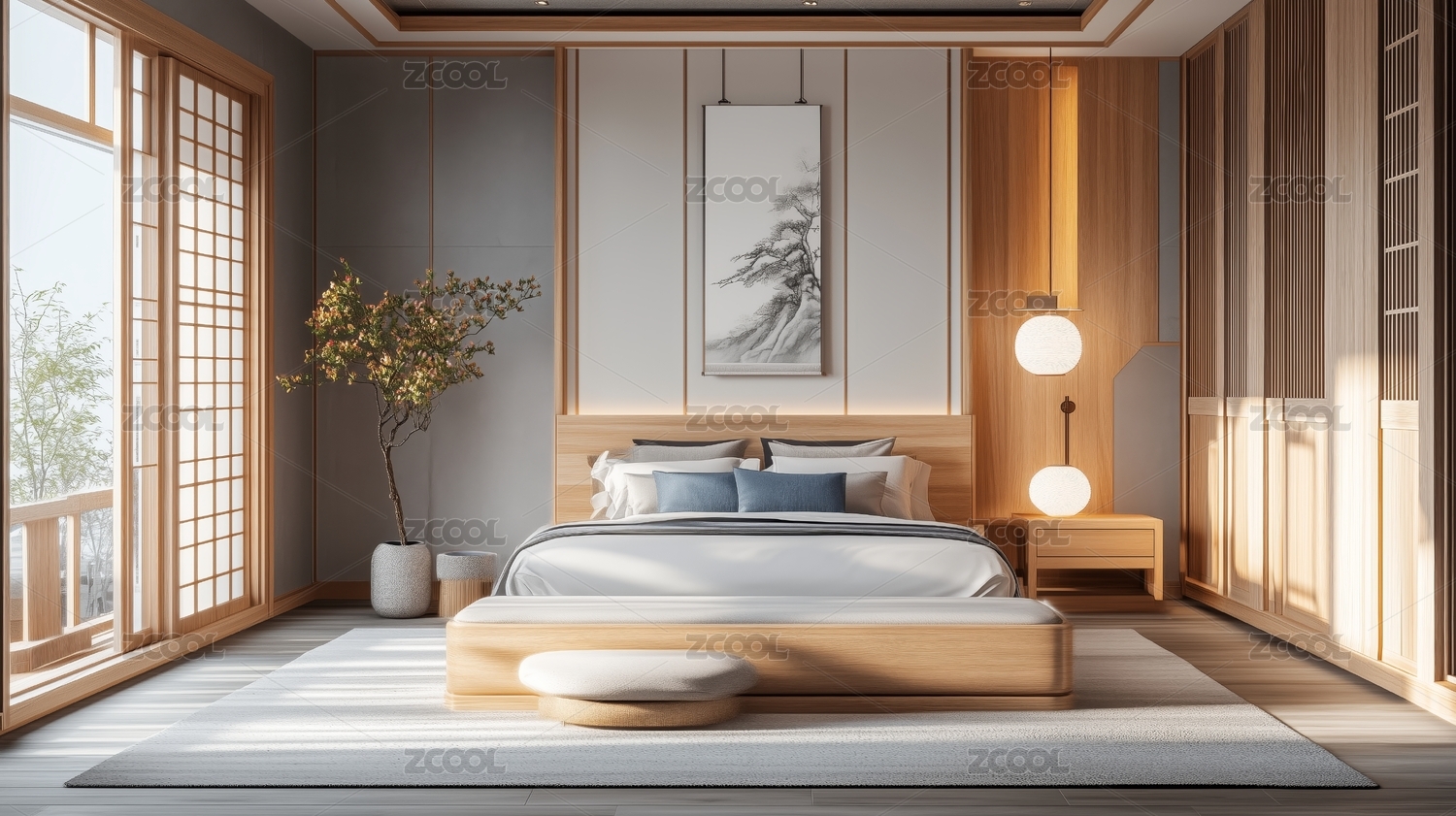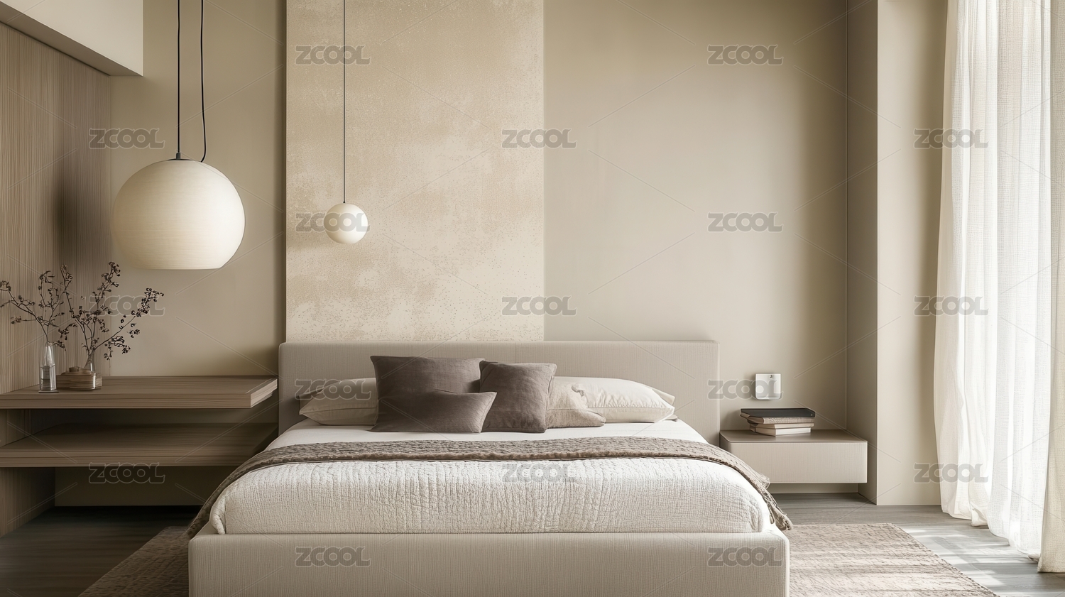 卧室,现代,东方,极简,床头,嵌入,木质,床品,色调,中性