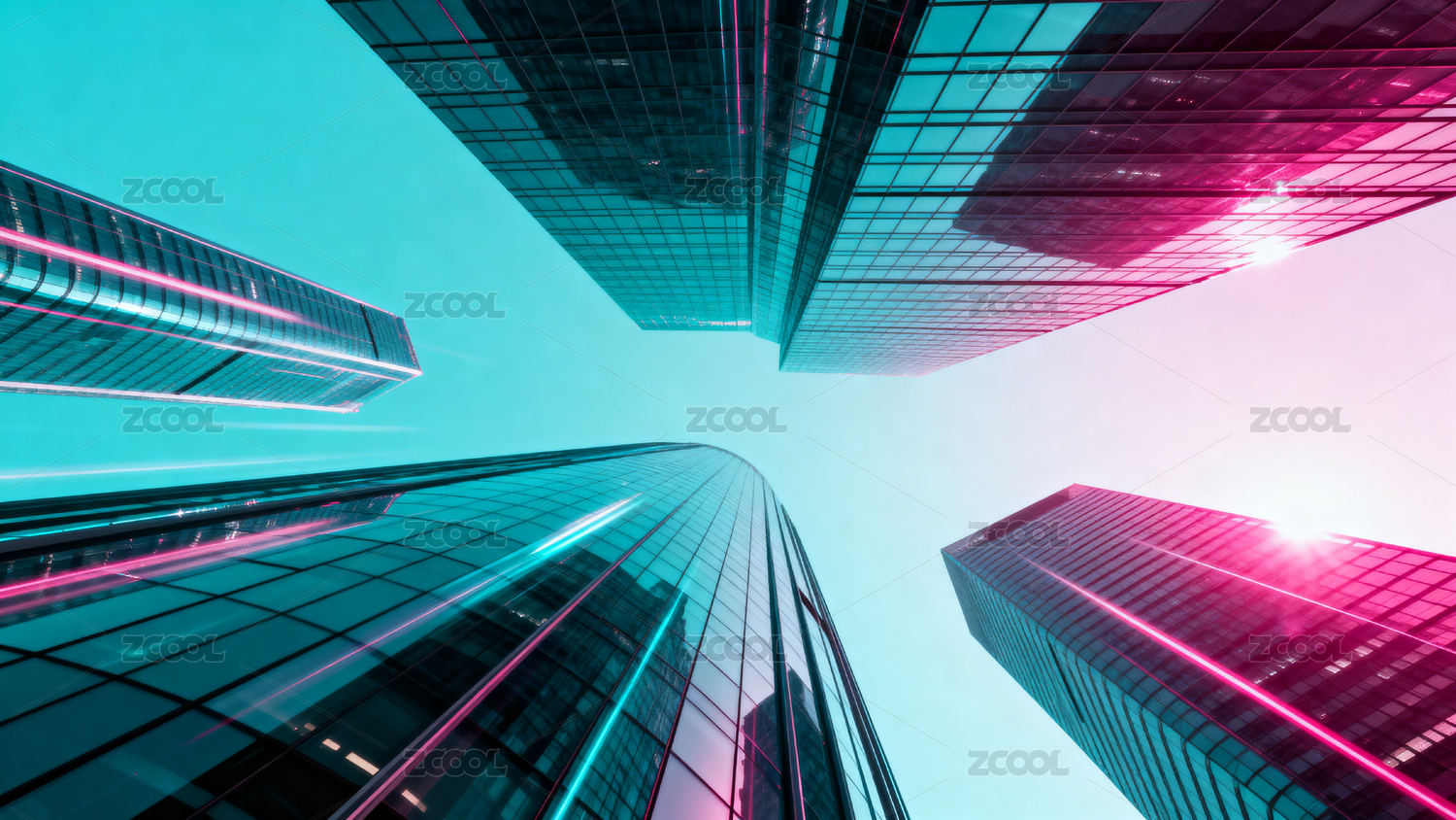 玻璃的摩天大楼建筑物蓝红渐变商业背景
