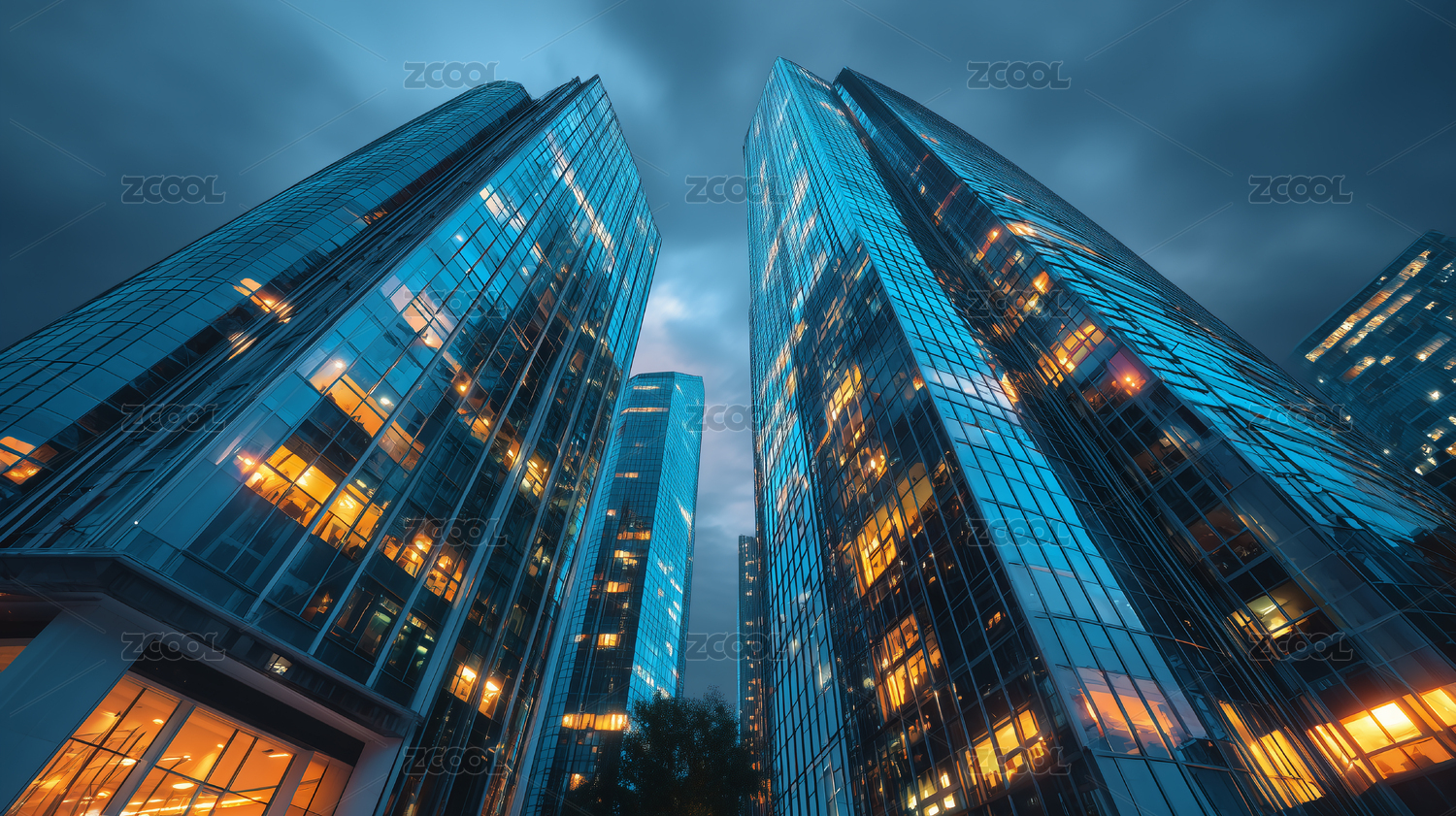 仰望现代都市的蓝色玻璃摩天大楼