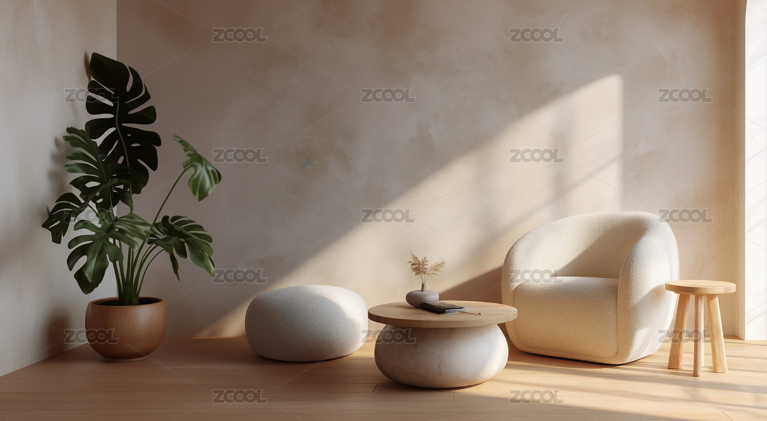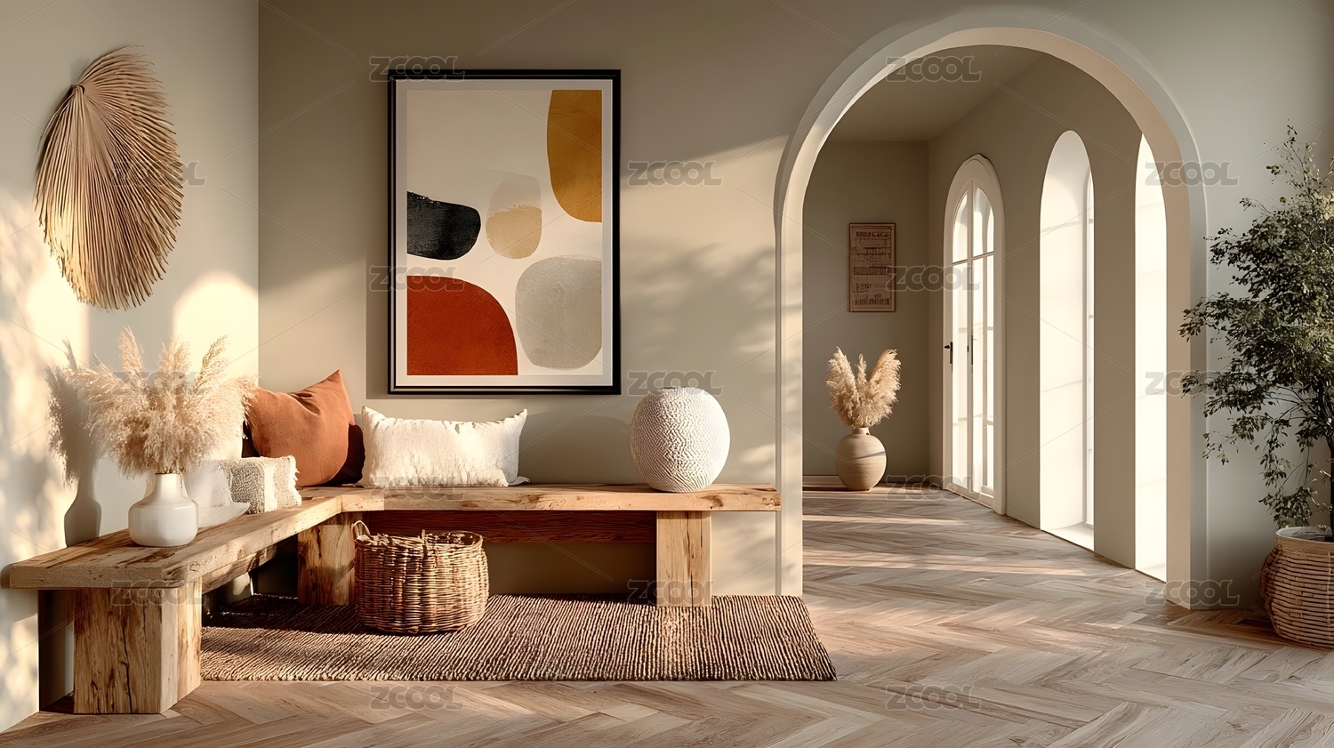 客厅,波西米亚,极简,椅子,藤编,靠垫,艺术品,墙面,抽象,咖啡桌