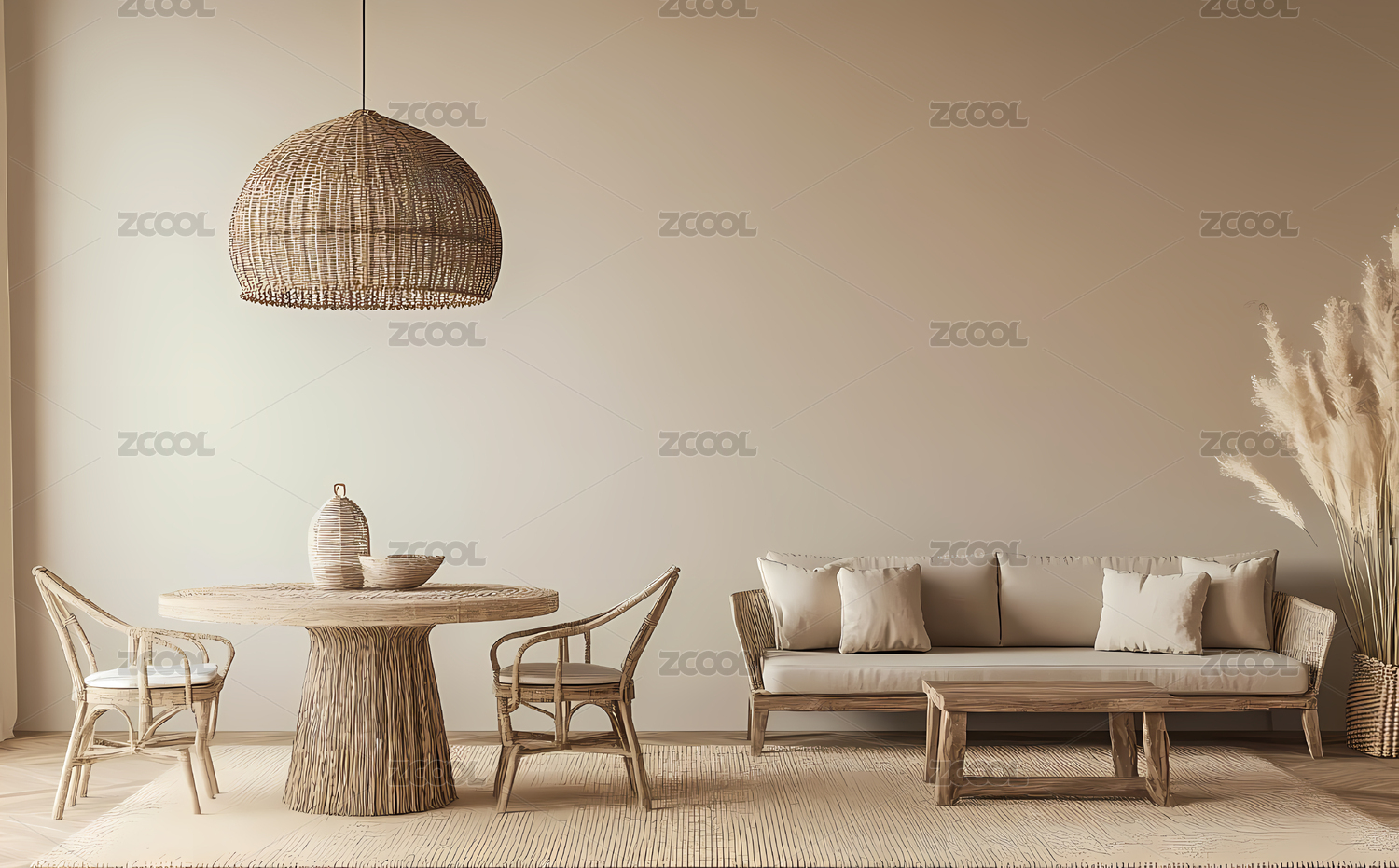 客厅,波西米亚,极简,椅子,藤编,靠垫,艺术品,墙面,抽象,咖啡桌