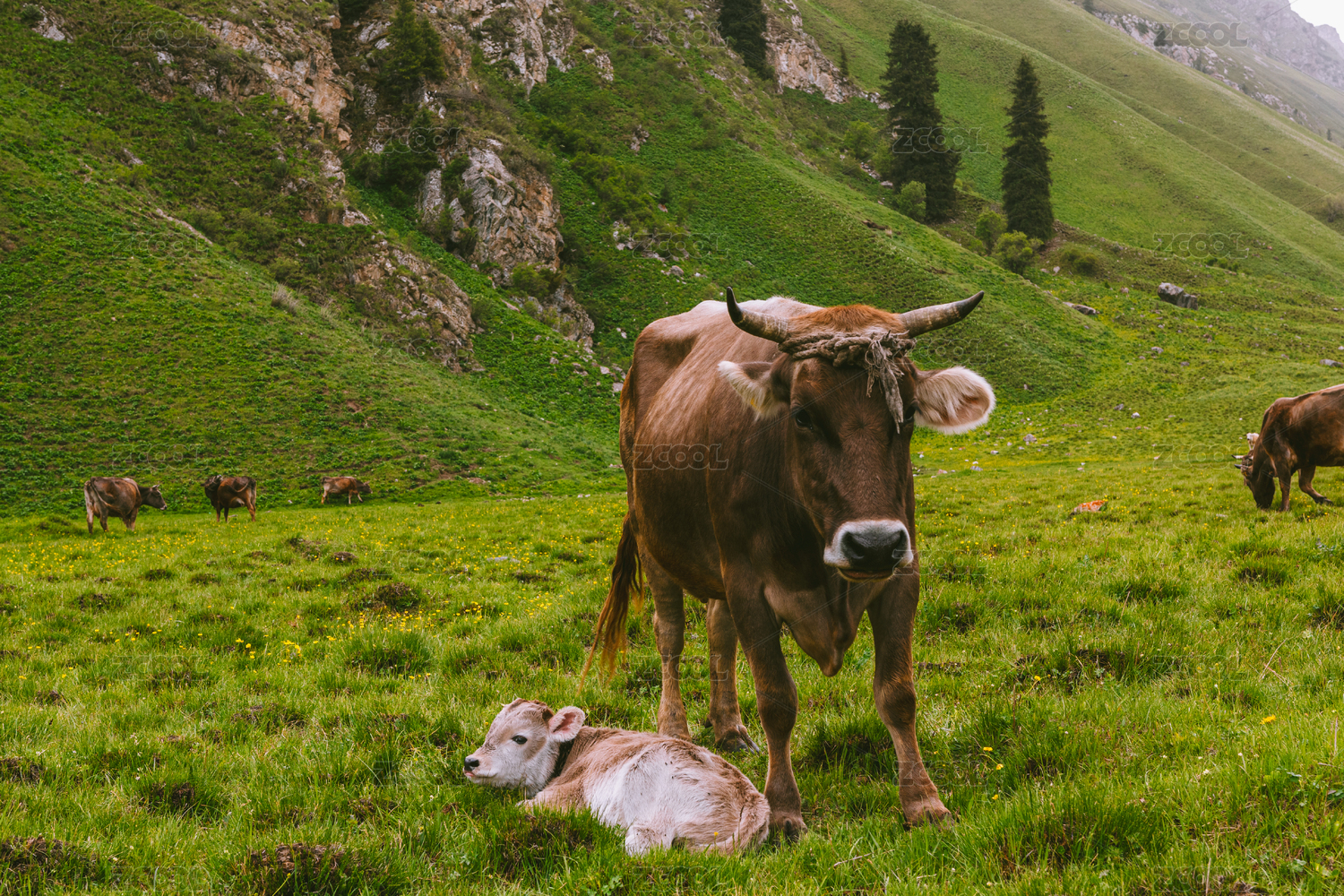 中国新疆阿勒泰布尔津躺在草地上反刍的牛